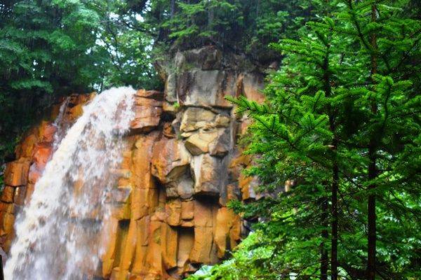 火砕流が堆積した溶結凝灰岩。滝の壁には茶色の柱状節理がみられたのであった。なんか、ちとおどろおどろしい感じはした。