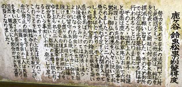 そのころ、法然上人の弟子、住蓮と安楽は鹿ケ谷の草庵において六時礼賛による声明念仏という御法事を営み、御仏の功徳を人々に説いておられました。ことに、二人の声は先を急ぐ人も思わず足を止め聞き入ってしまうほどであり、そこを通りかかった院御所女房の鈴虫と松虫も深い感動をおぼえたのでありました。