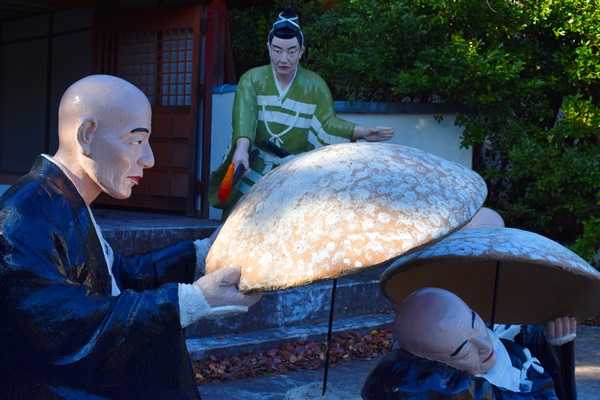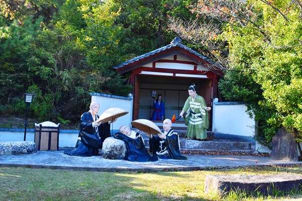 そこで聖人はこの地の扇屋の門をたたき一夜の宿を請うことにしました。しかし扇屋夫婦は邪険に断り「軒下なら勝手にするがいい。」と言って戸を閉めてしまいました。そこで聖人は厚く礼をのべられ、念仏を唱えながら夜の明けるのをお待ちになりました。