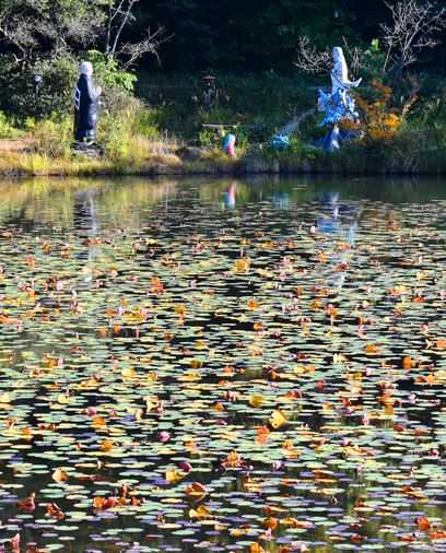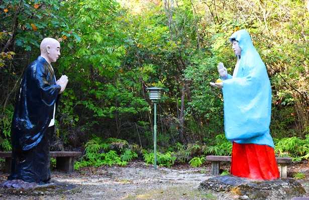 これを聞いた法然上人は嘆き、如何にしてでも我が悟る所の他力の要路を、師阿門梨に告げたいものと池の面を尋ねられました。すると一天にわかに掻き曇り、雷鳴しきりに鳴り渡り、千尋もある大蛇が現れました。法然上人は、他力の教法についてねんごろに説かれましたが、時既に遅しと大蛇は嘆き、両眼から涙を流します。入定の時、苦行に耐えて貴方の御出世を待ちますから済度の幸せを賜れとの弥勒菩薩への誓いは捨てられぬと、さめざめ嘆きながら水底へ帰られました。(公式HPより)
