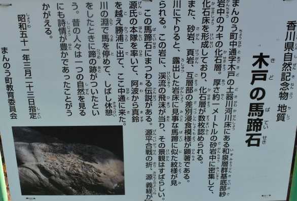 馬蹄石伝説、源平合戦の時、源義経が源氏の本隊を率いて、阿波からここ中通に来て、沼の淵で馬をとめて、しばし休憩をした蹄の跡がついたと、まあ、そんな話。