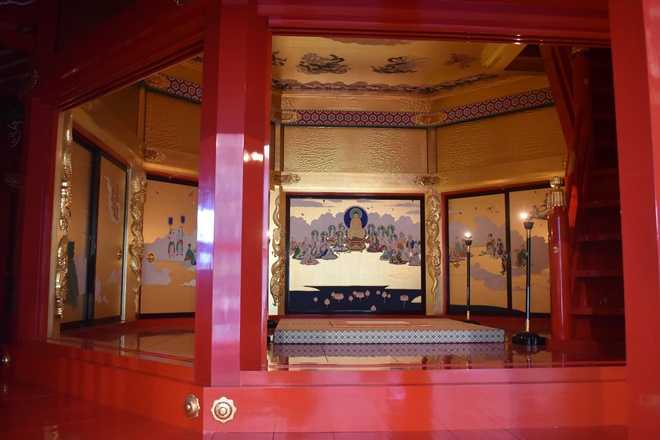 天人影向図の天井。99平方メートル。金箔の壁、釈迦説法図の襖絵。総朱漆塗りの床、畳は2枚。
