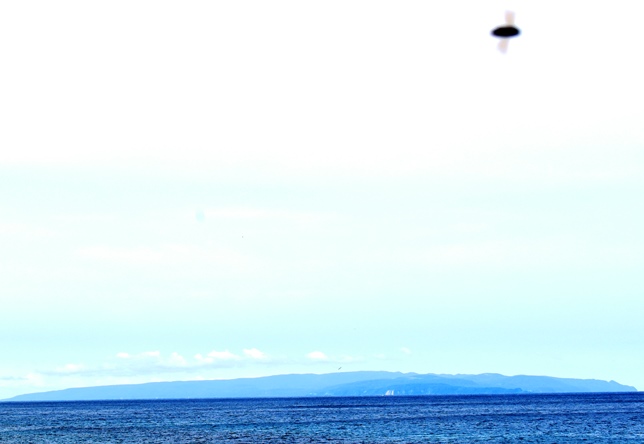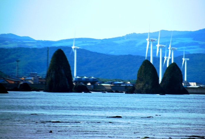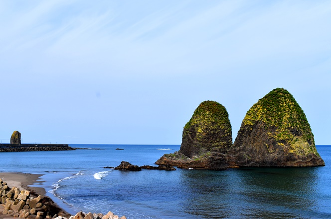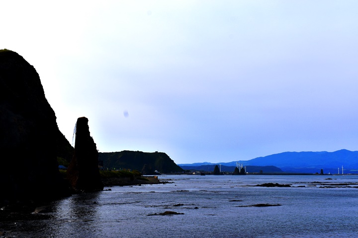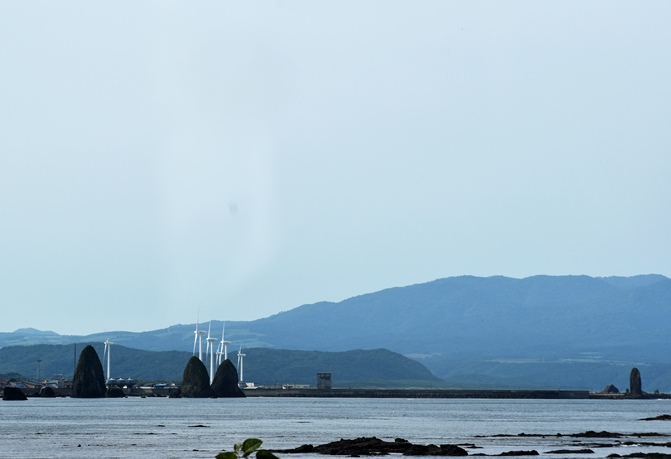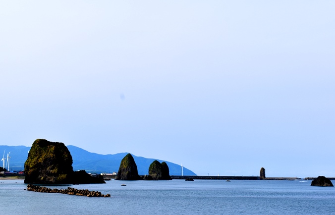 三本杉岩の奥に瀬棚町のロウソク岩。
