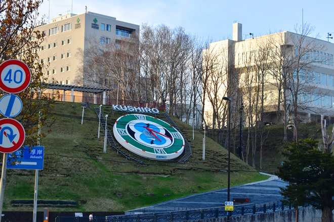 釧路市時計、幣舞橋(ぬさまいばし)を越えたところ。夕陽が沈むころ幣舞橋で多くの観光客が写真を撮っていた。