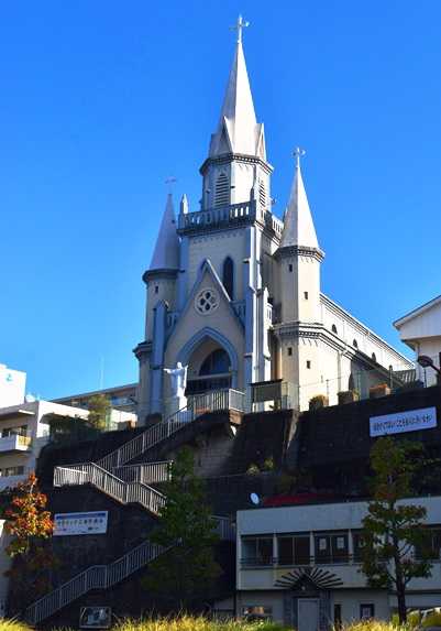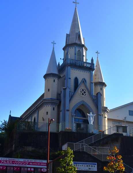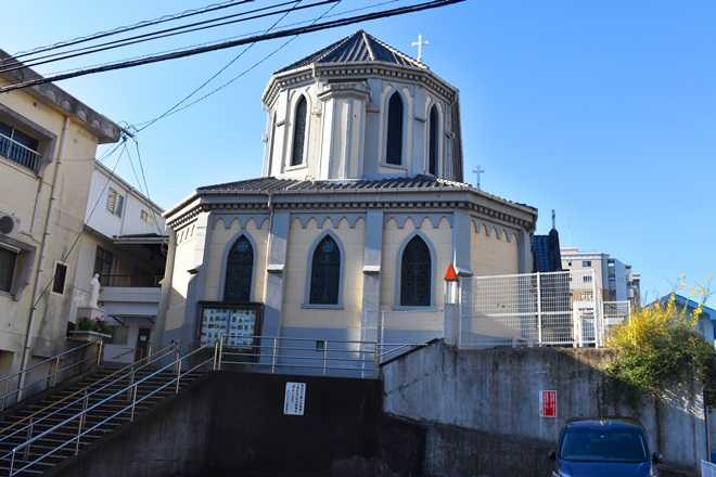 佐世保駅そばの教会。尖塔のあるゴシック様式の鉄筋コンクリート造り。昭和6年(1931)の建立。