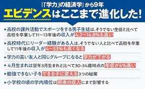 ②3歳から10歳までにスポーツをすることで高収入になる確率が高くなる。なぜなら、スポーツ活動により、忍耐力や協調性が身につくため。