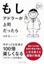 小倉 広先生の「もしアドラーが上司だったら」を紹介します。この本を読んだきっかけは、もともとアドラーの心理学に興味があり、職場の人間関係に生かすことができないかと思いました。新入社員がアドラー心理学を学んだ上司と出会い、物事の考え方を変化させ、自分自身を成長させていく物語に解説としてアドラー心理学が書かれており、わかりやすかったです。共感できる部分がいくつもあったので紹介します。①できていないことより、できたことの注目すべきである。できなかったと嘆くよりも、できていることに注目して心を向上させる方がよい②仕事ができなくても、自分の存在価値は変わらない。仕事ができる機能価値と自分の人間性の部分の存在価値は切り離して考えるべきである。会社の評価が低い、仕事でミスをしたからと言って、自分自身を全否定することはない。③ 他人を喜ばせることを心がける人間は他人の役に立つことで自分の存在価値を確認している。人に感謝されるように心がける必要がある。④ 失敗から何を得ることができたのかを考える癖をつける。人は必ず失敗するものである。その失敗で落ち込むのか?それとも失敗から学ぶのかは考え方次第である。マイナス部分にあるプラスの部分を見つける習慣が必要となる。以上の他にも共感する部分がたくさんありました。本の帯に書いてある通りに仕事が楽しくなりそうな1冊です。