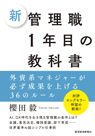 櫻田先生の「新 管理職1年目の教科書」を紹介します。この本を読んだきっかけは、私が部下を持つ立場になり、日々四苦八苦しているからです。現状を良い方向にするためにこの本から学ぼうと思いました。共感する部分を紹介します。①必ずいつまでにするのかの期限を共有する。②「自分で成長して結果を出す」という気概無くしては、良い仕事ができない。③新しい仕事が来たら、少しだけ取り掛かり、難易度を測ったり、内容を理解し、ゴールからの逆算をする。④仕事ができる人のメールの返信は速い。⑤締め切り間際の滑り込みセーフをやめる。⑥上司が部下を見ることの10倍も部下は上司をよく見ている。⑦仮説・検証の繰り返しで正解にたどり着くことの繰り返しが成長する。以上の他にも勉強になることがたくさん書いてありました。私は外資系管理職ではありませんが、十分に参考になる1冊でした。