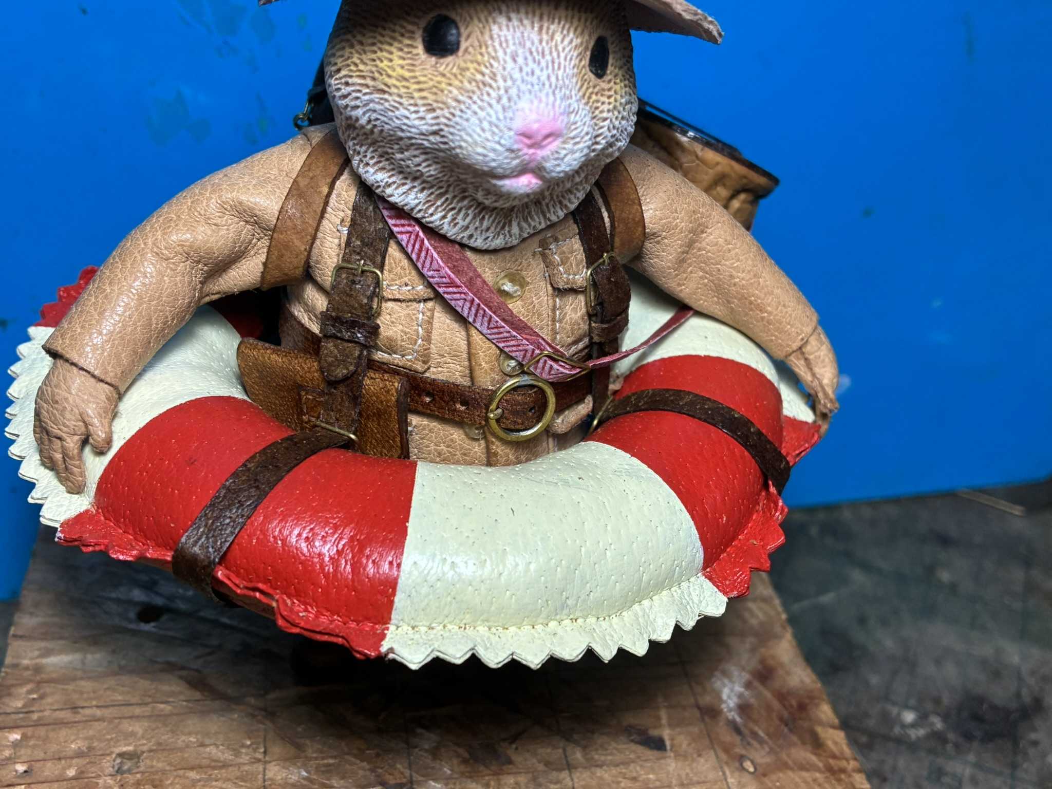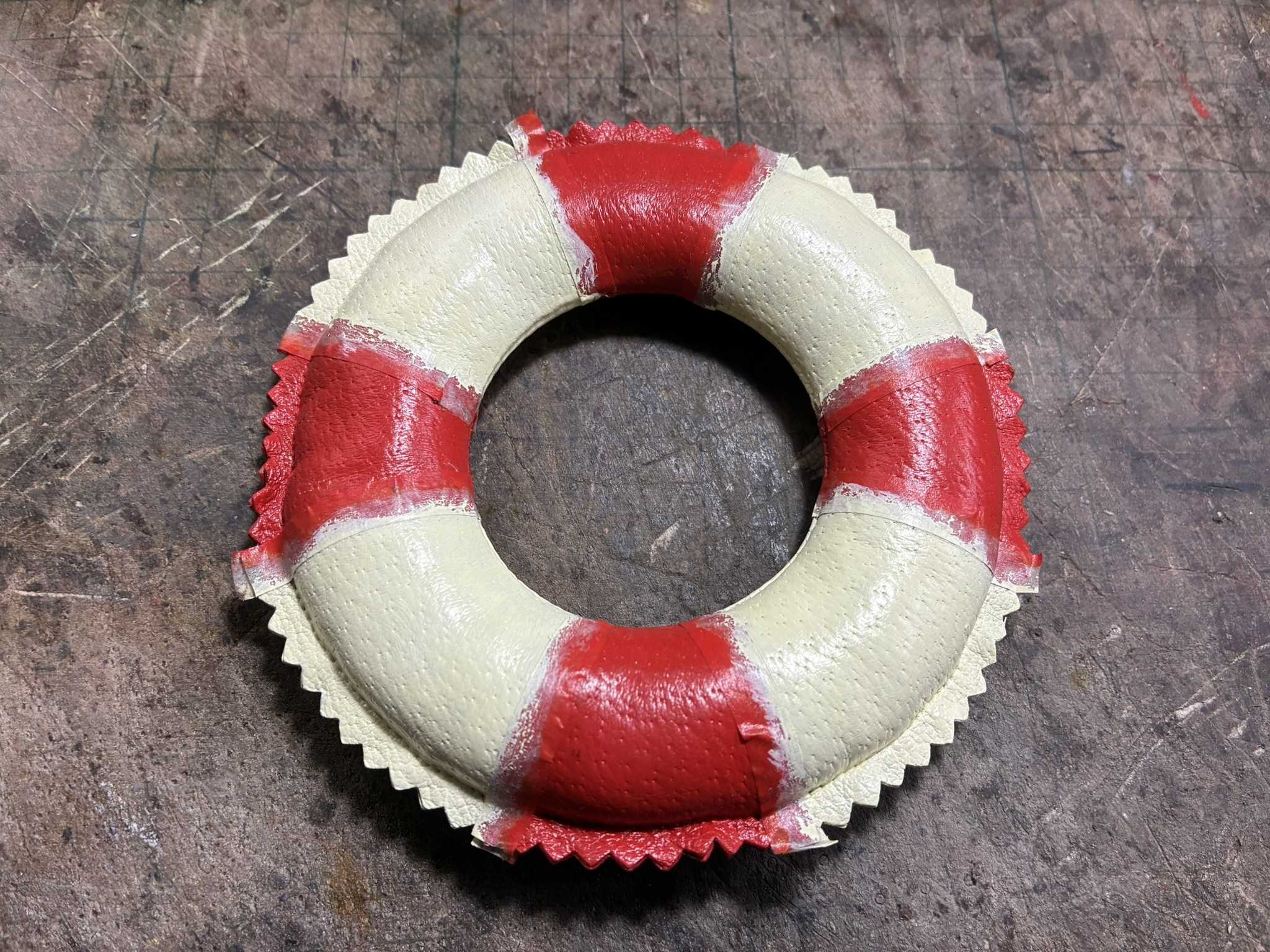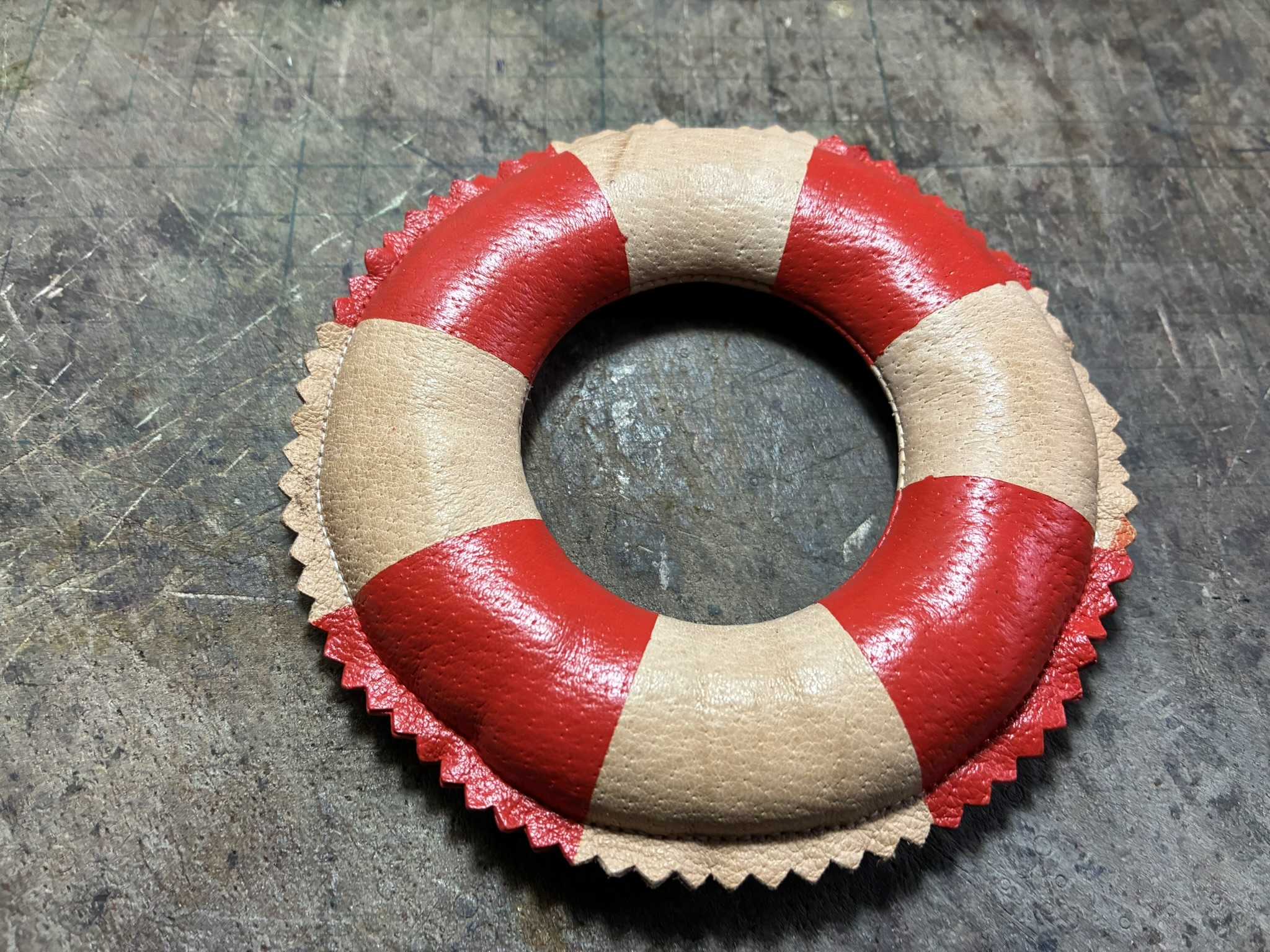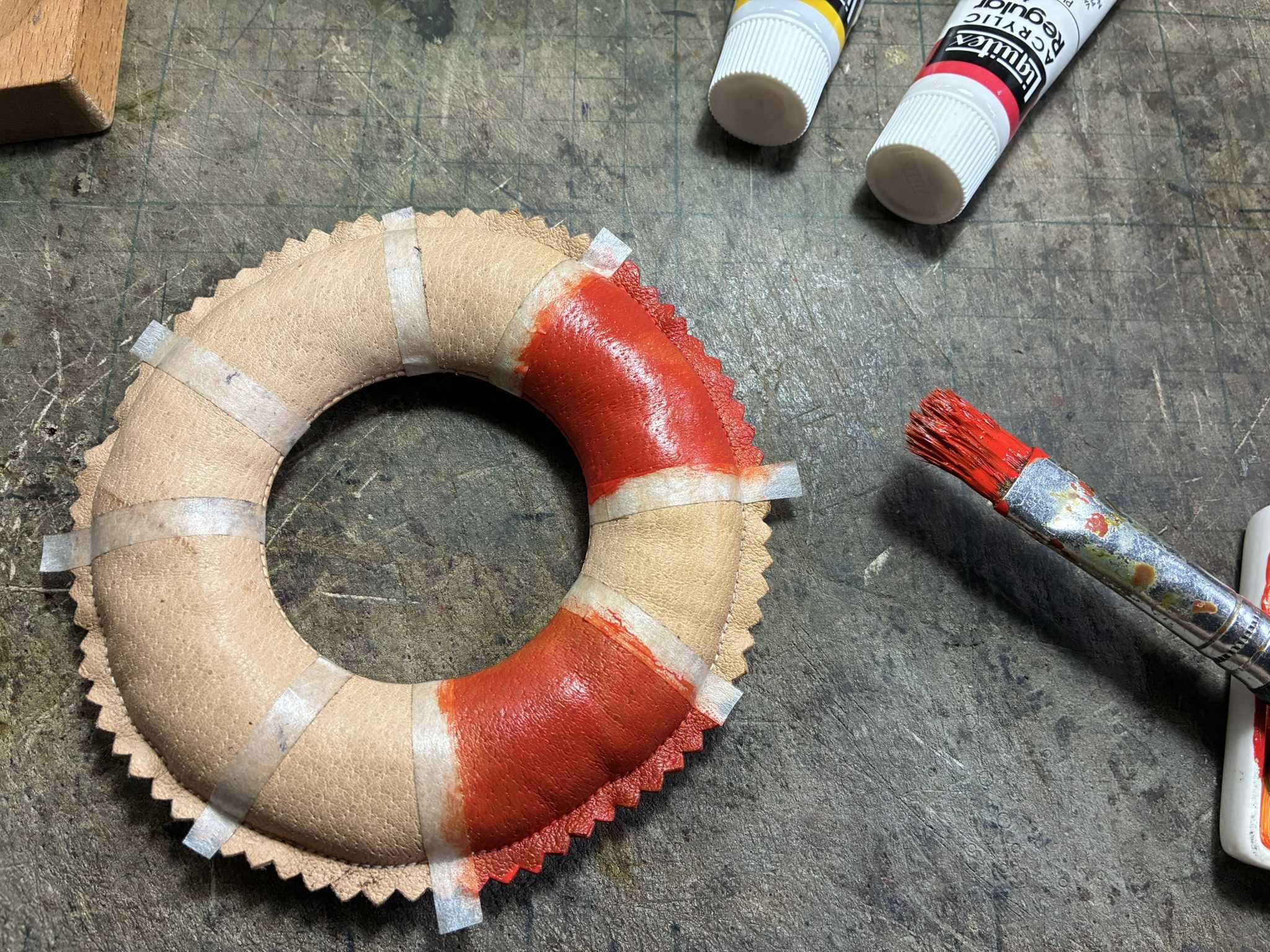 革で作った浮き輪に、アクリル絵の具で着色していきます。