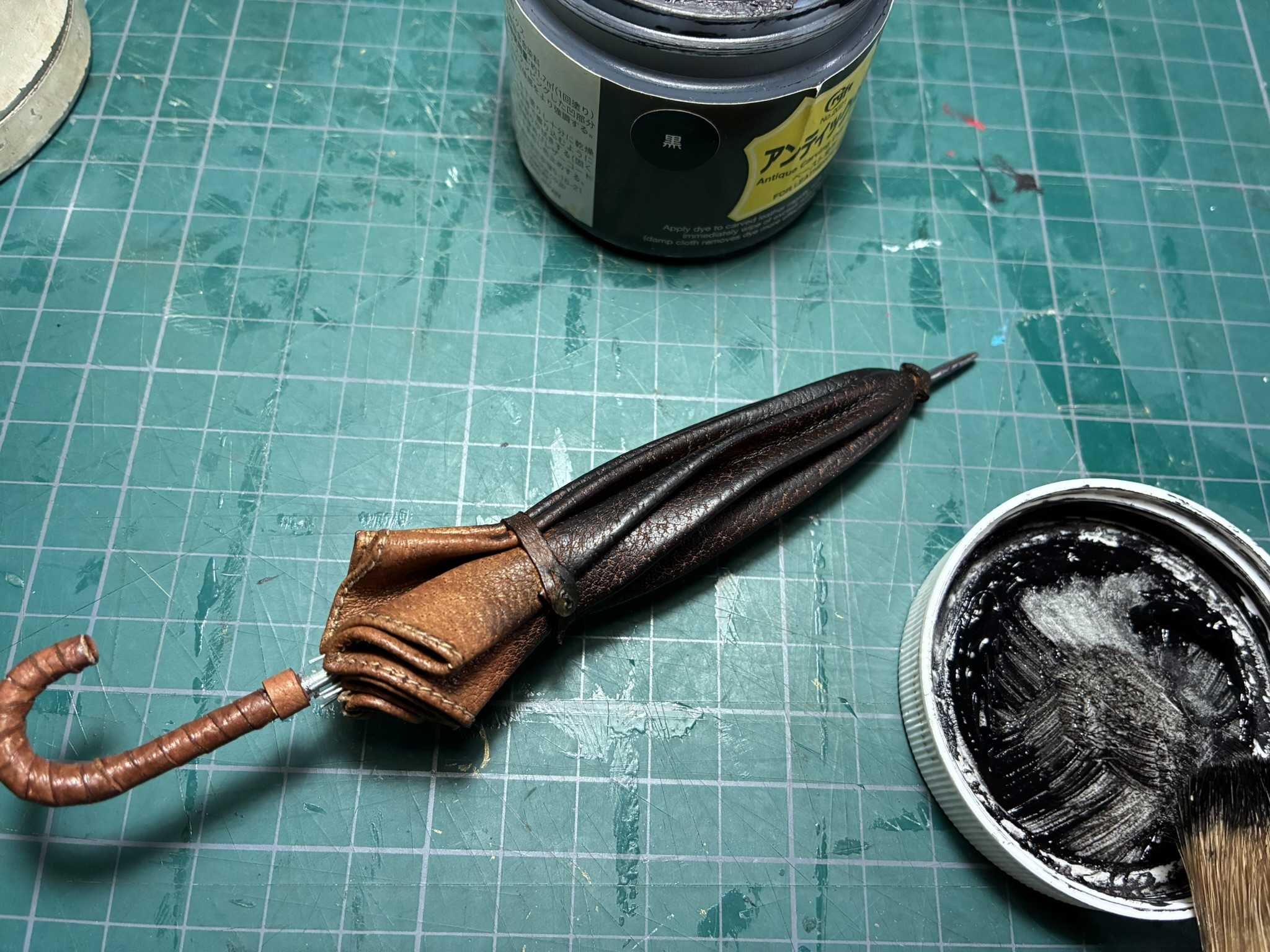 伸ばした針金を傘に取り付けました。傘に芯棒を入れ、持ち手に革を巻きました。