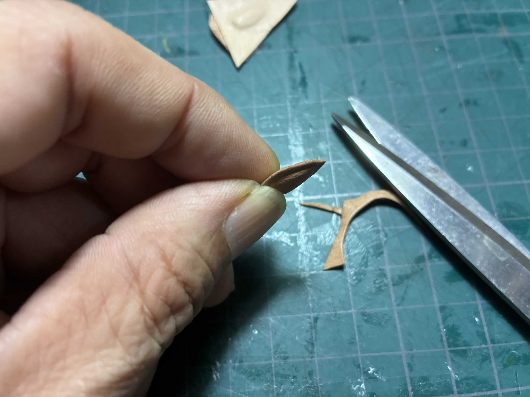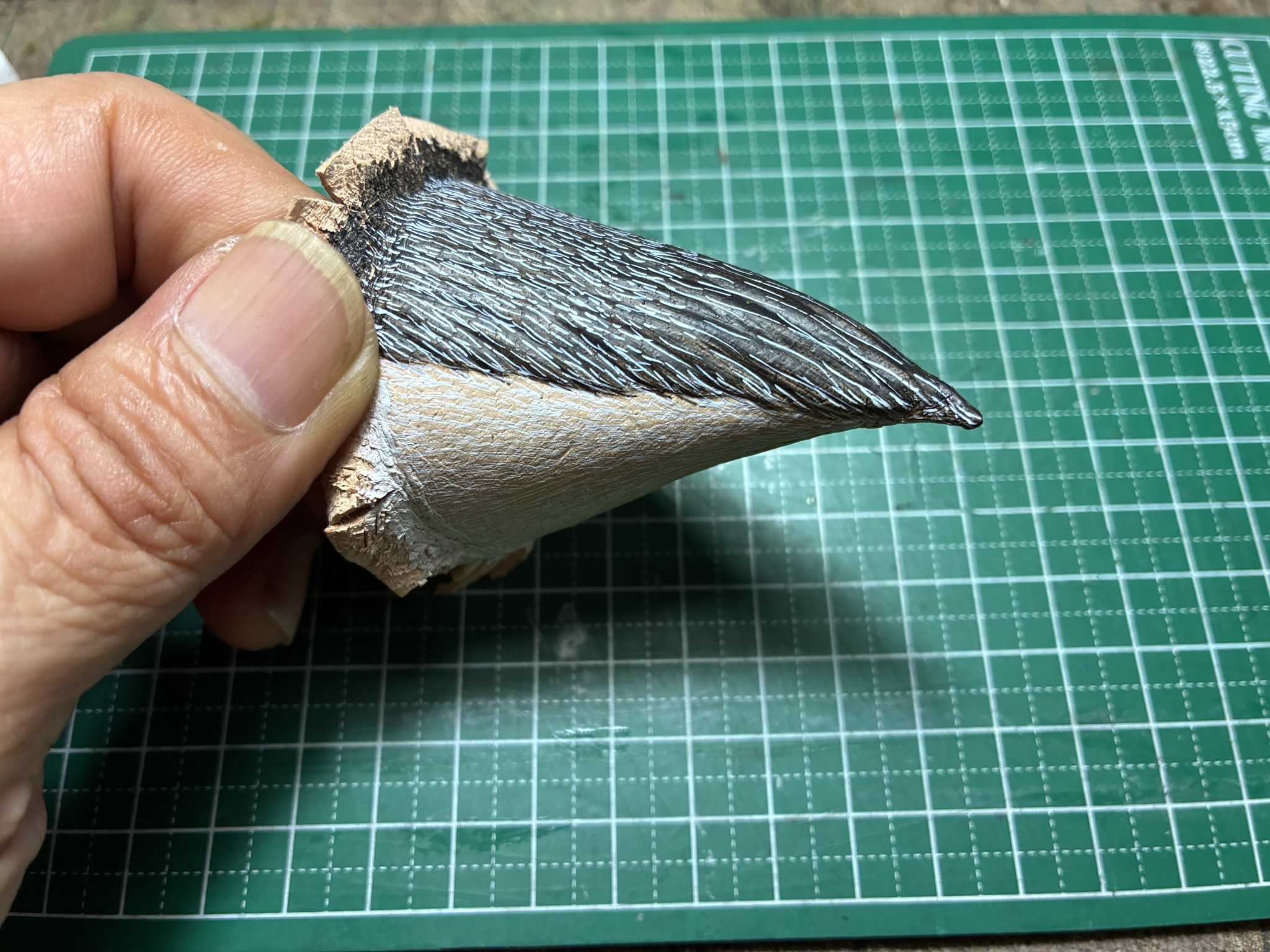 尻尾に貼り込んだ革の合わせ目を、カッターで切れ目を入れて繋ぎます。革が合わさっているところに、カッターの刃を入れて切れ目を入れます。先端は後で処理します。切れ目の入ったところの、いらない革を取り除き、合わせ目を木工ボンドで貼り合わせます。先端を切り落として、尾羽の筋を押さえます。
