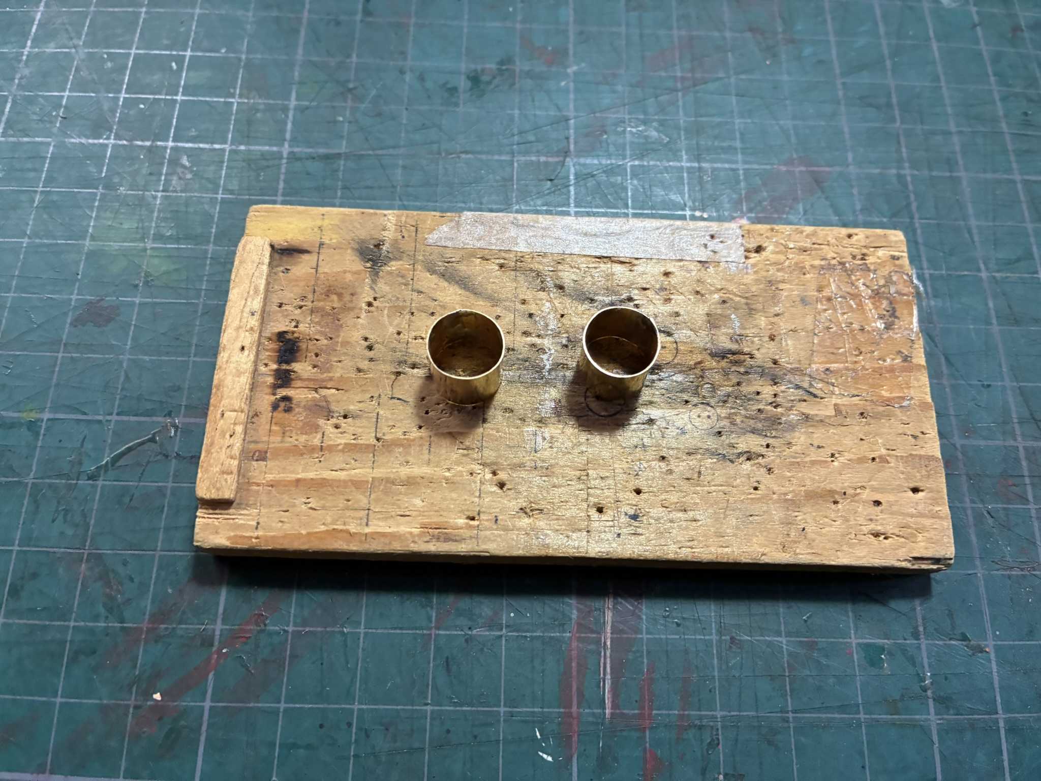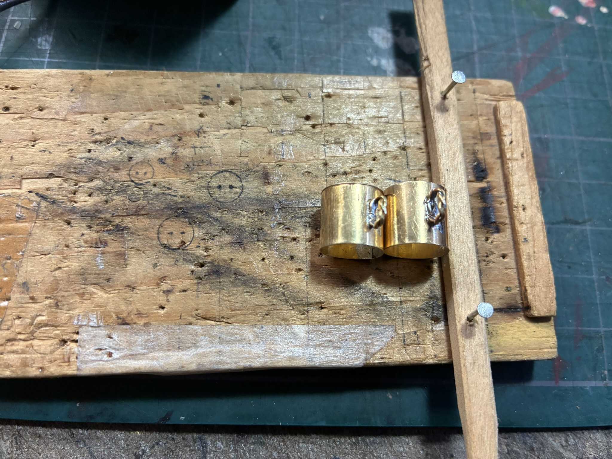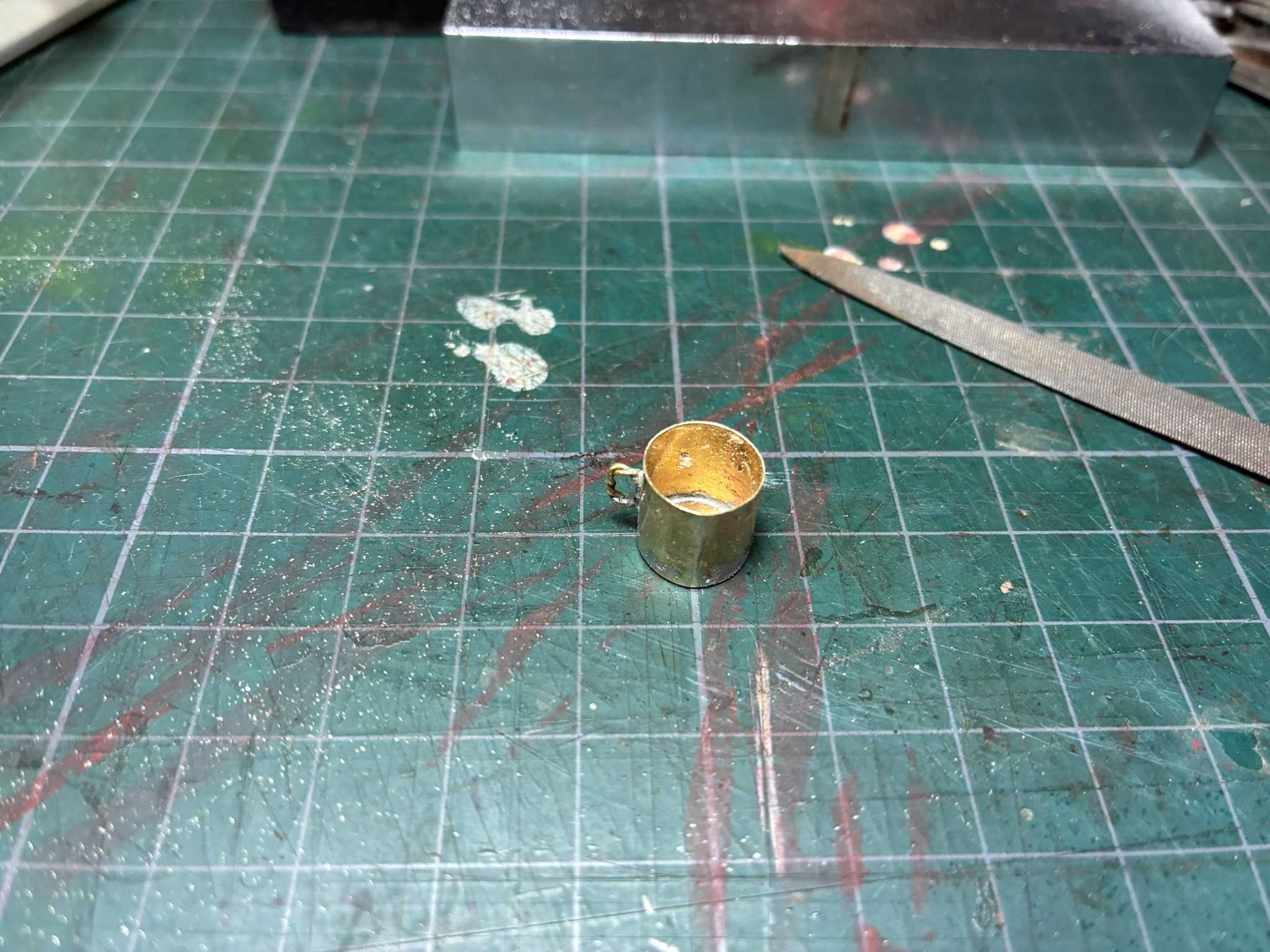 切り出した真鍮板を丸めて、ハンダ付けしました。カップの持ち手を0.7ミリの真鍮線をねじってから、叩いて作ります。ねじり線を楕円形に丸めました。