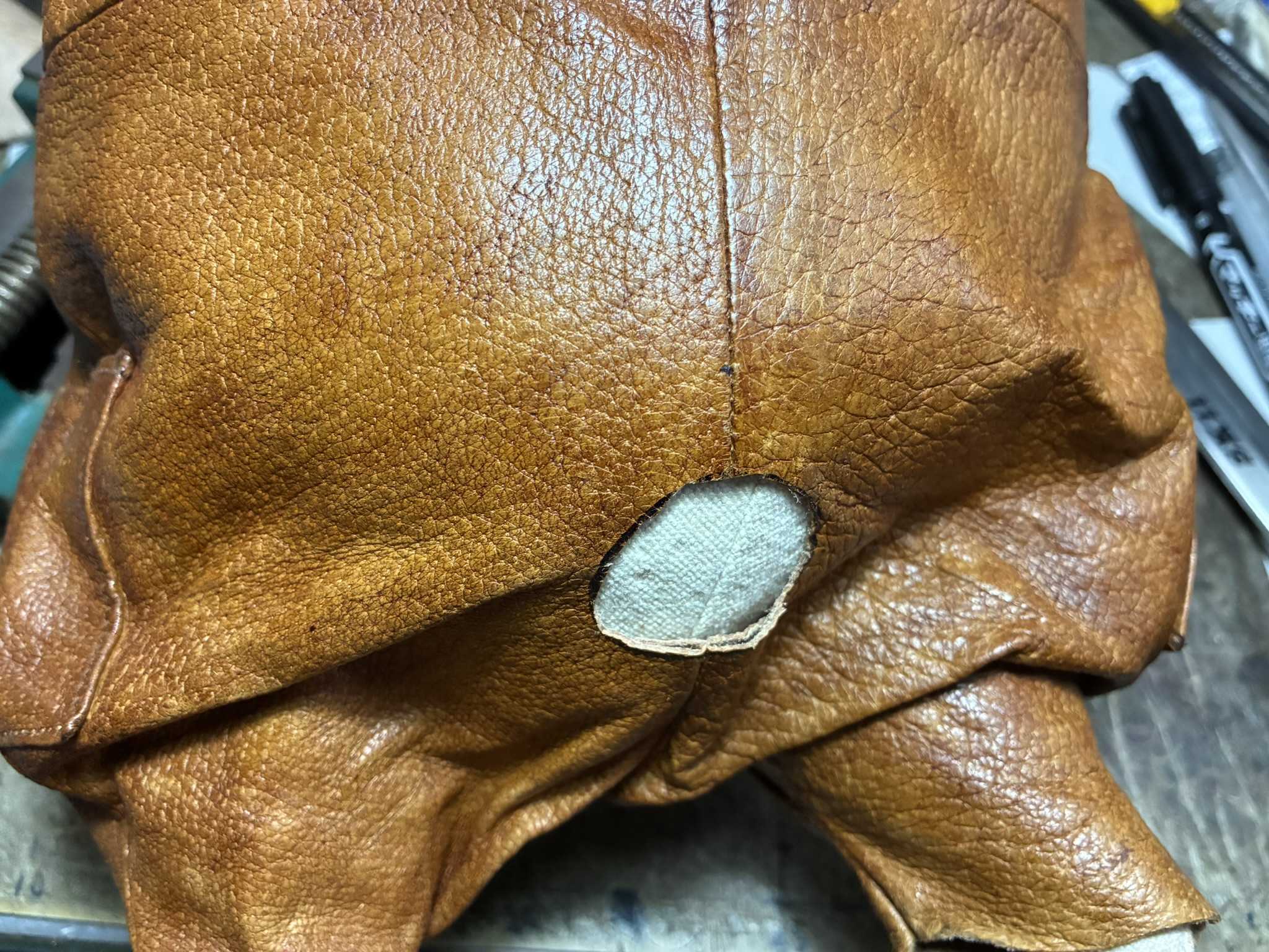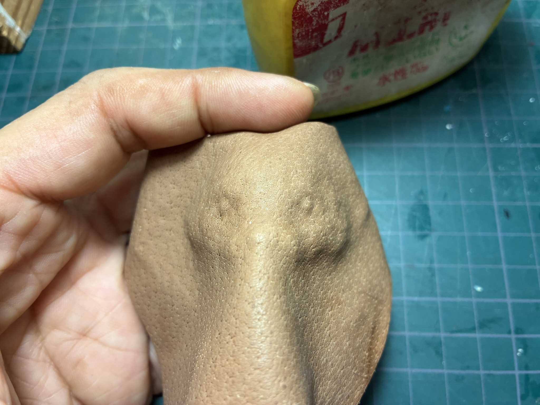 石粉粘土で作った尻尾に布を当てて、型紙を作ります。ブタ革を切り出しました。尻尾に木工ボンドを塗って、革を貼り込みます。貼り込んだら、すぐに凹凸に革を押し込んでいきます。