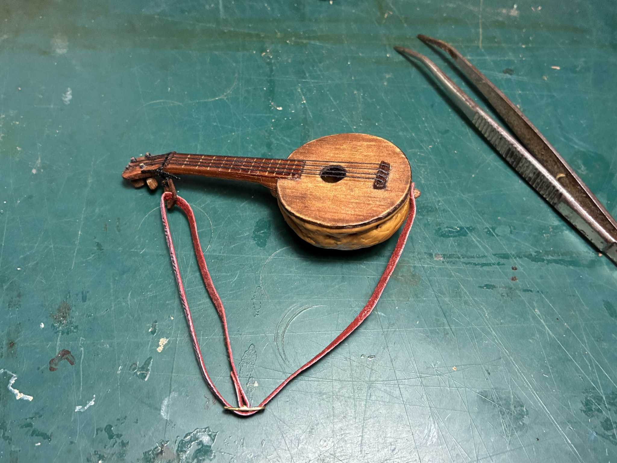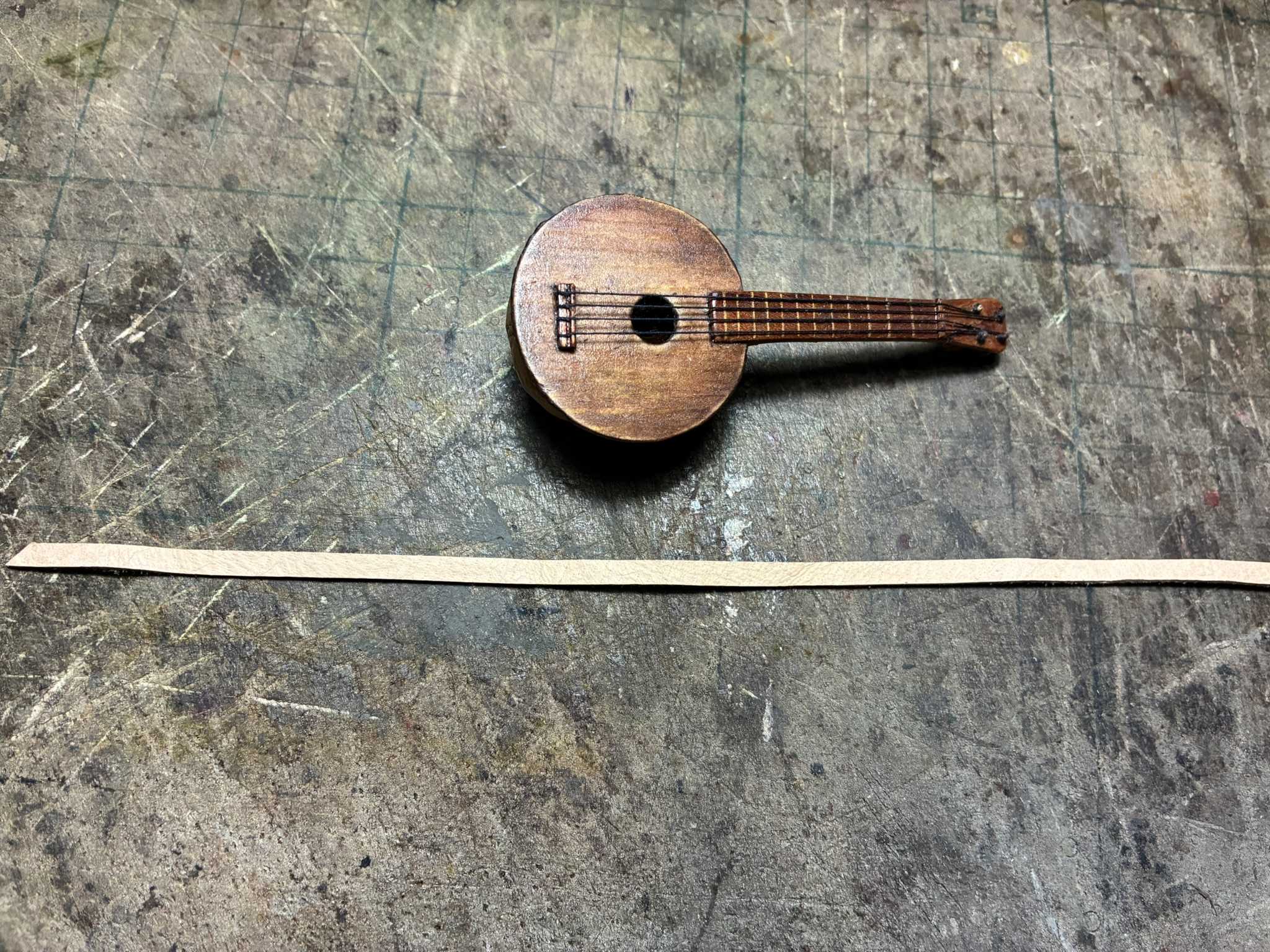 ウクレレのベルトを、アクリル絵の具で着色しました。ベルトに付ける金具を、真鍮線で作りました。