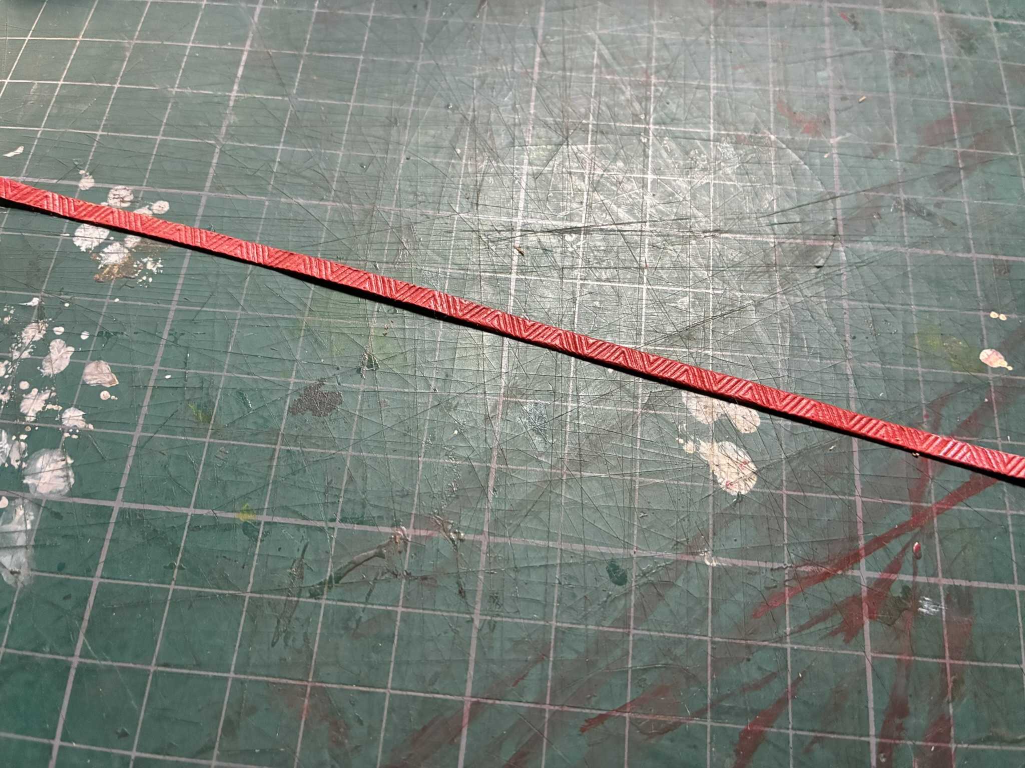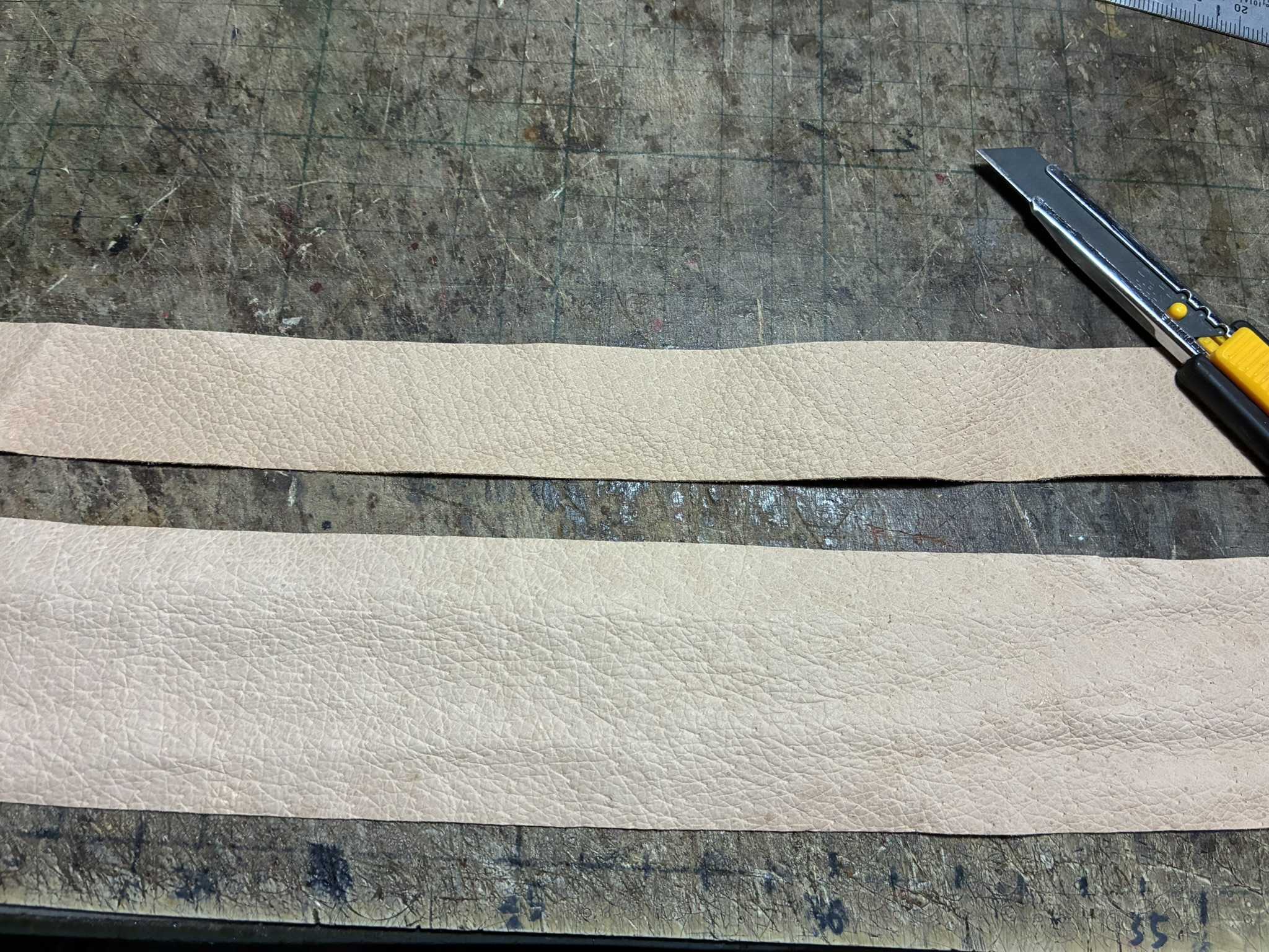 ウクレレのベルトを、羊革で作ります。羊革を3ミリ幅で切り出しました、革を湿らせて、刻印で模様を付けました。