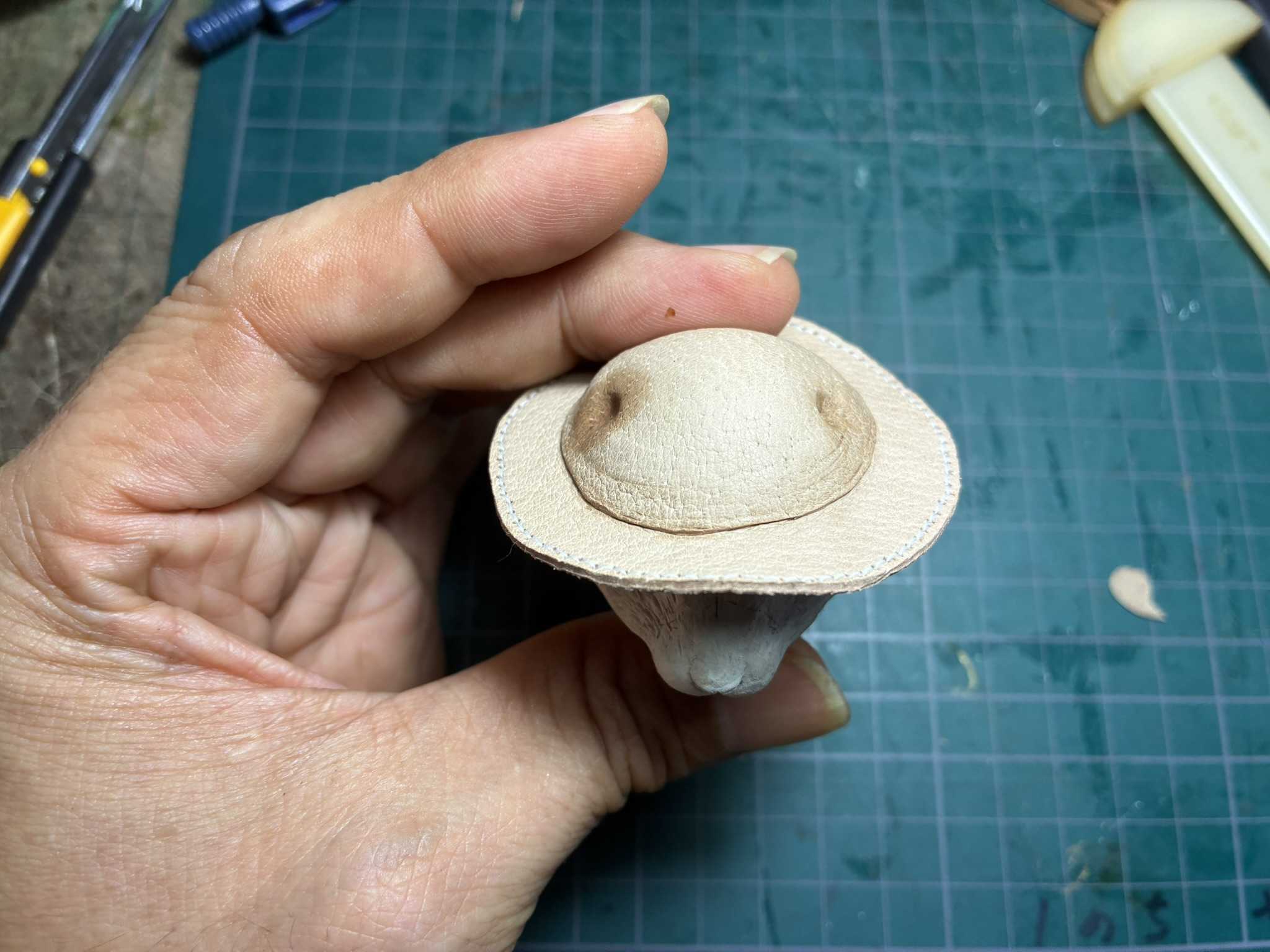 帽子の頭(クラウン)の部分は、革を湿らせてから球形に押し付けて、絞り出して作りました。鍔(つば)に頭部分を接着し、耳の位置を印付けします。