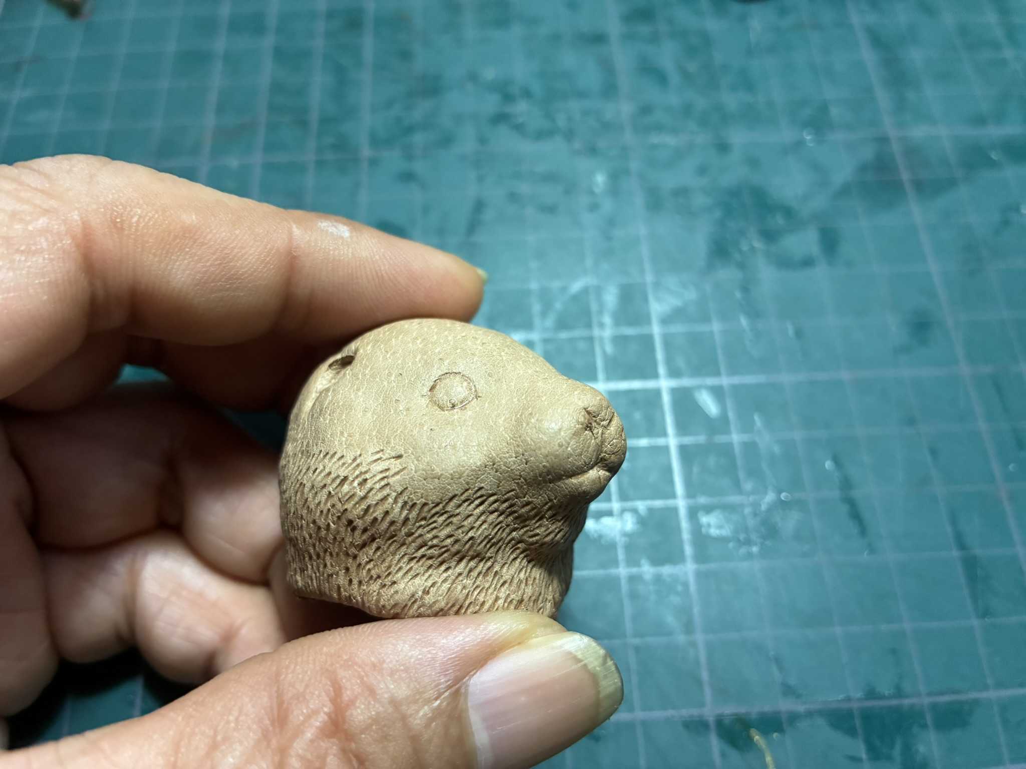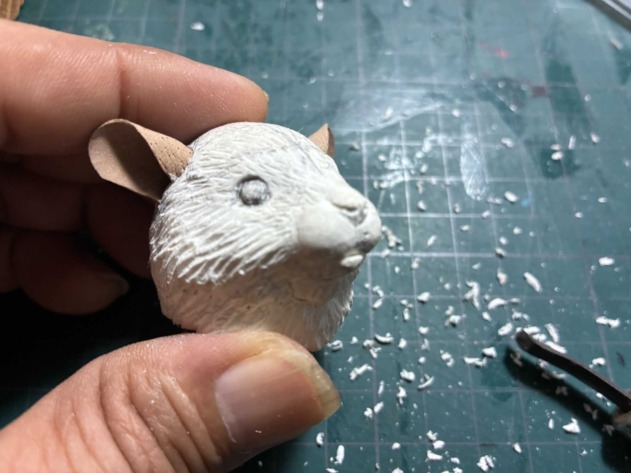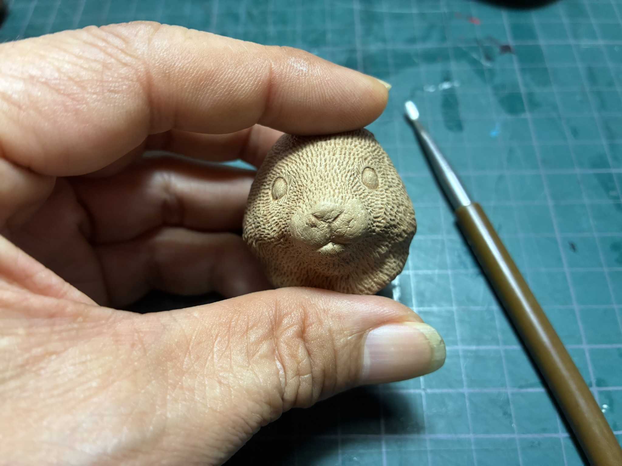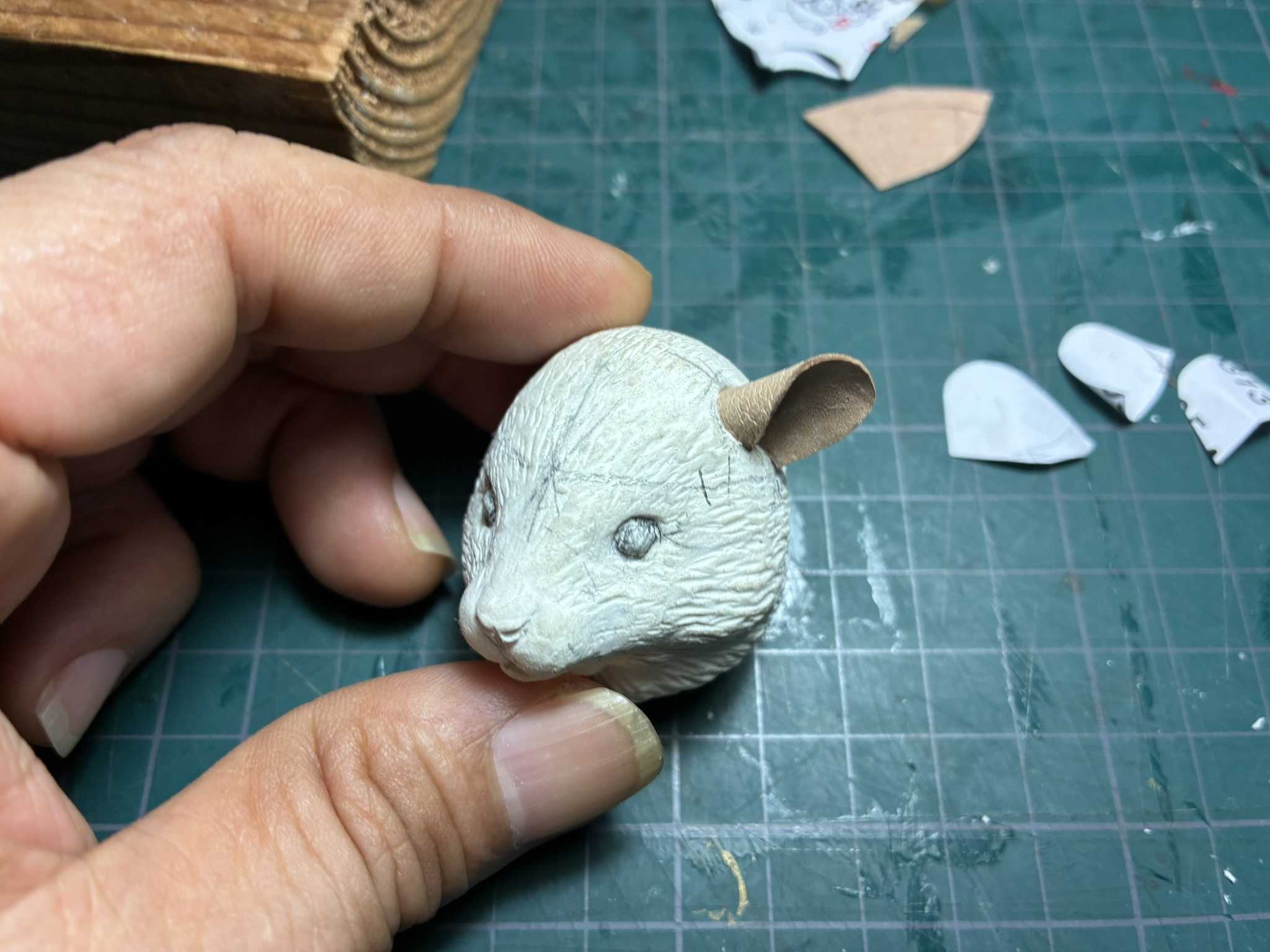 頭にアクリル絵具で彩色します。目を入れました。花と口元に下地として白を色を塗っておきます。白色の上にピンク色を重ねました。毛色に薄いきつね色を、ドライブラシで塗りました