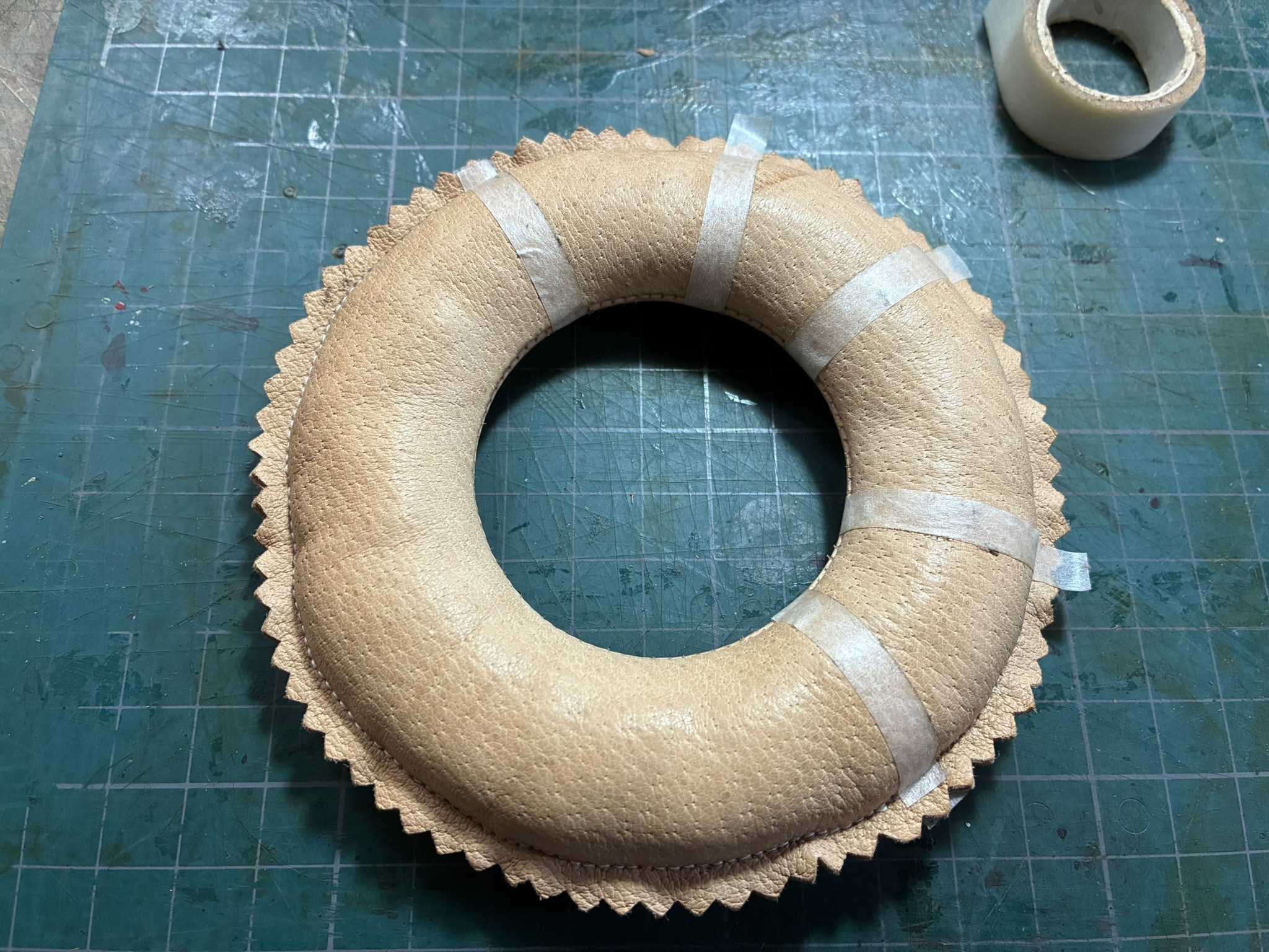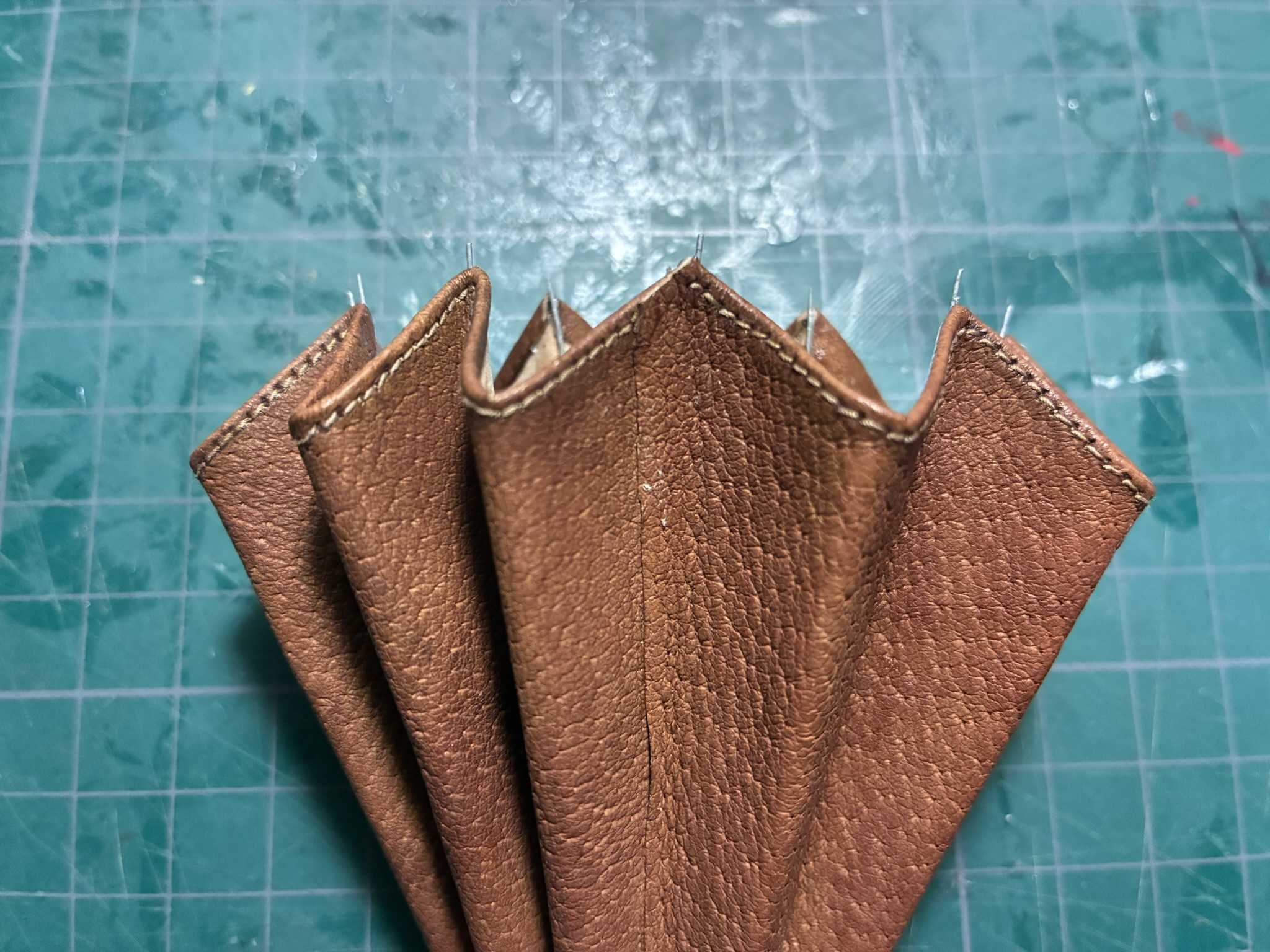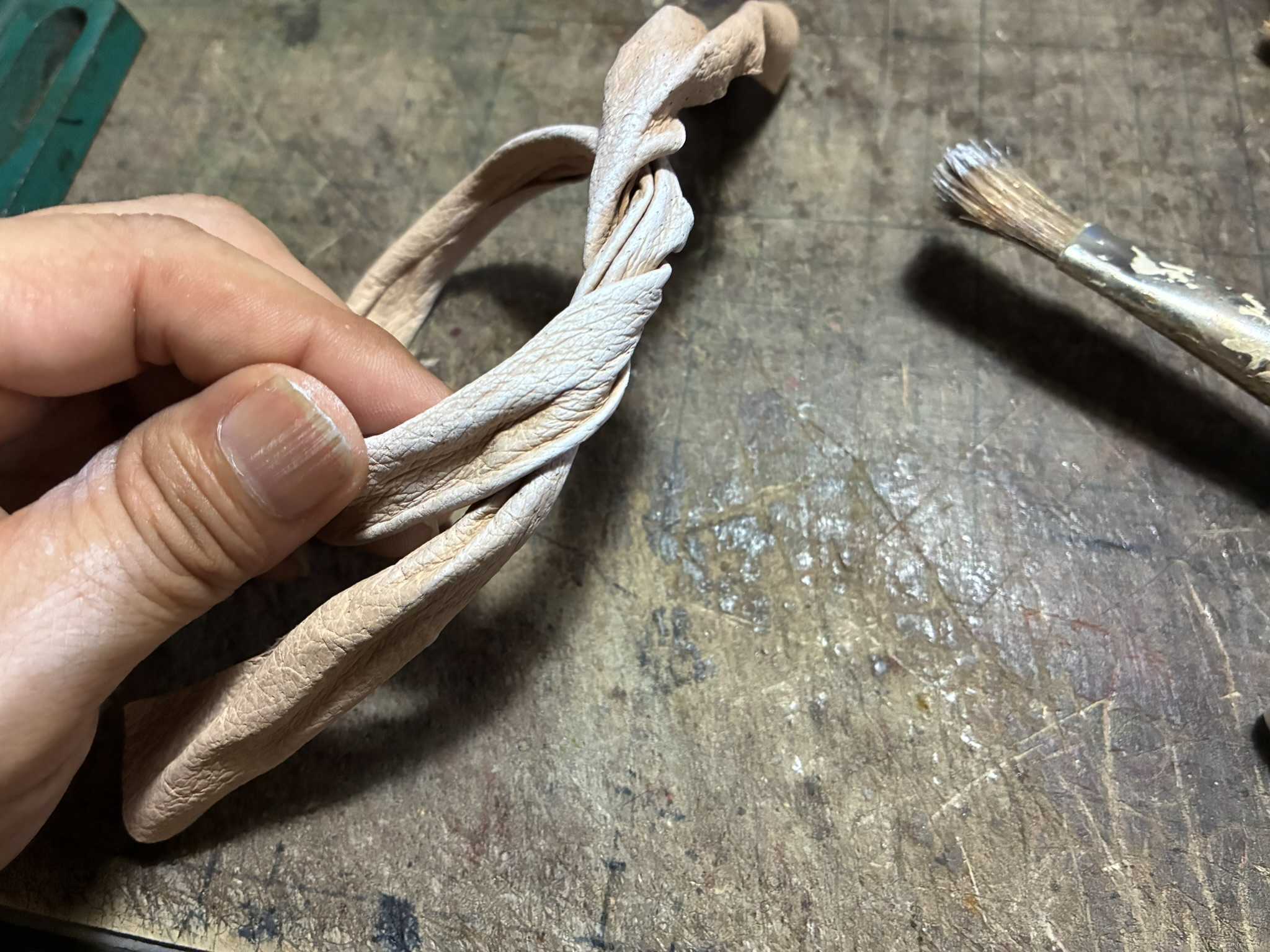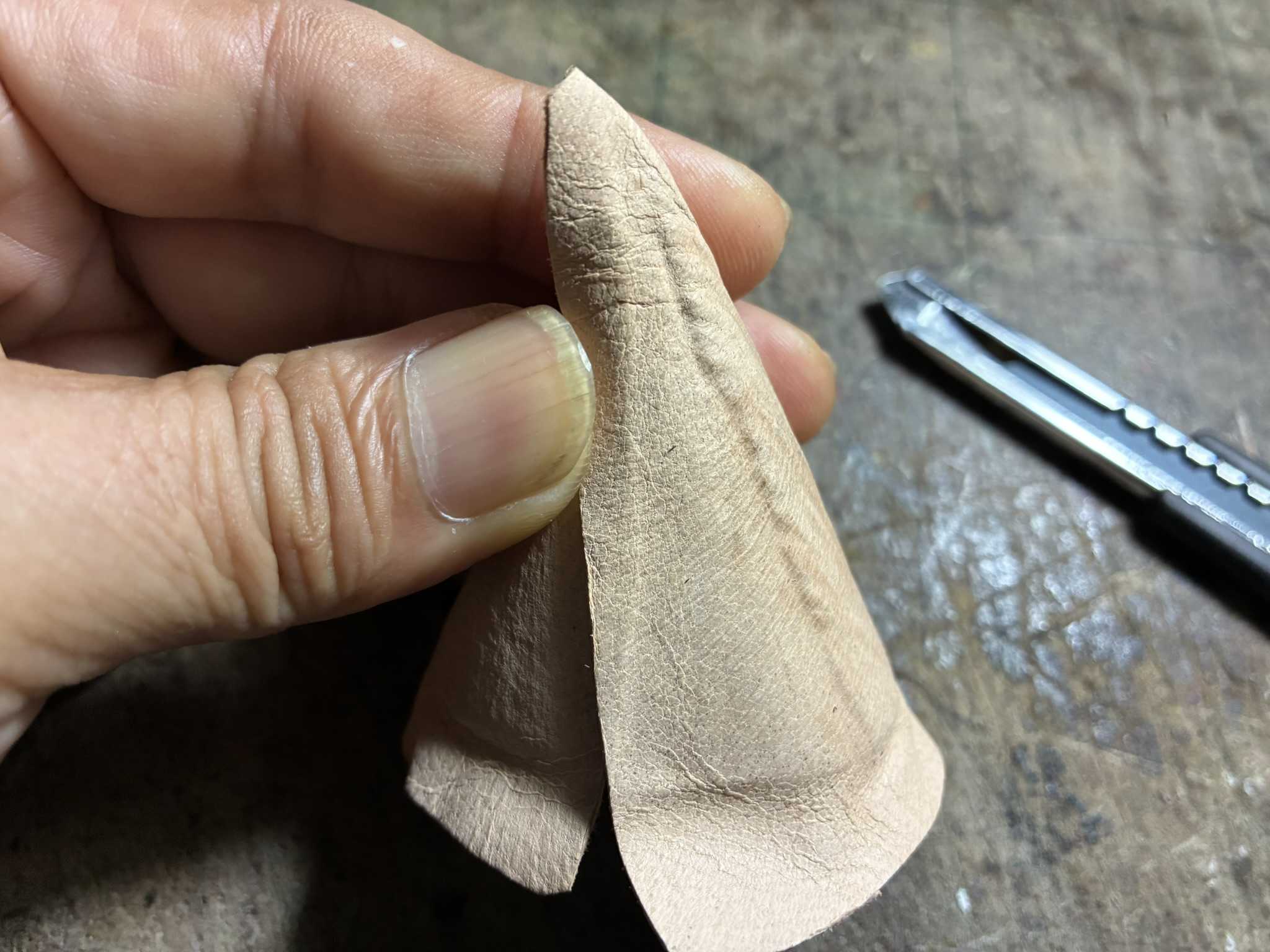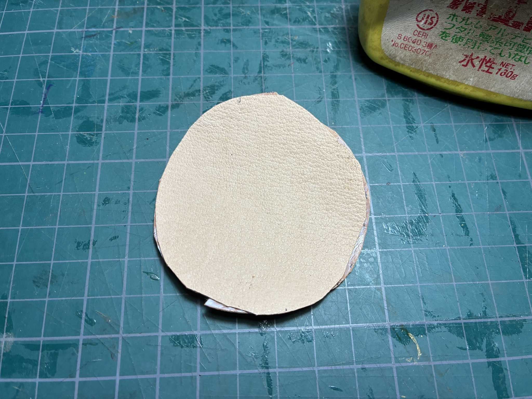 ハサミで余分な革を切り取り、革のコバを湿らせてからヘリ磨きで磨きます。革を貼りました。