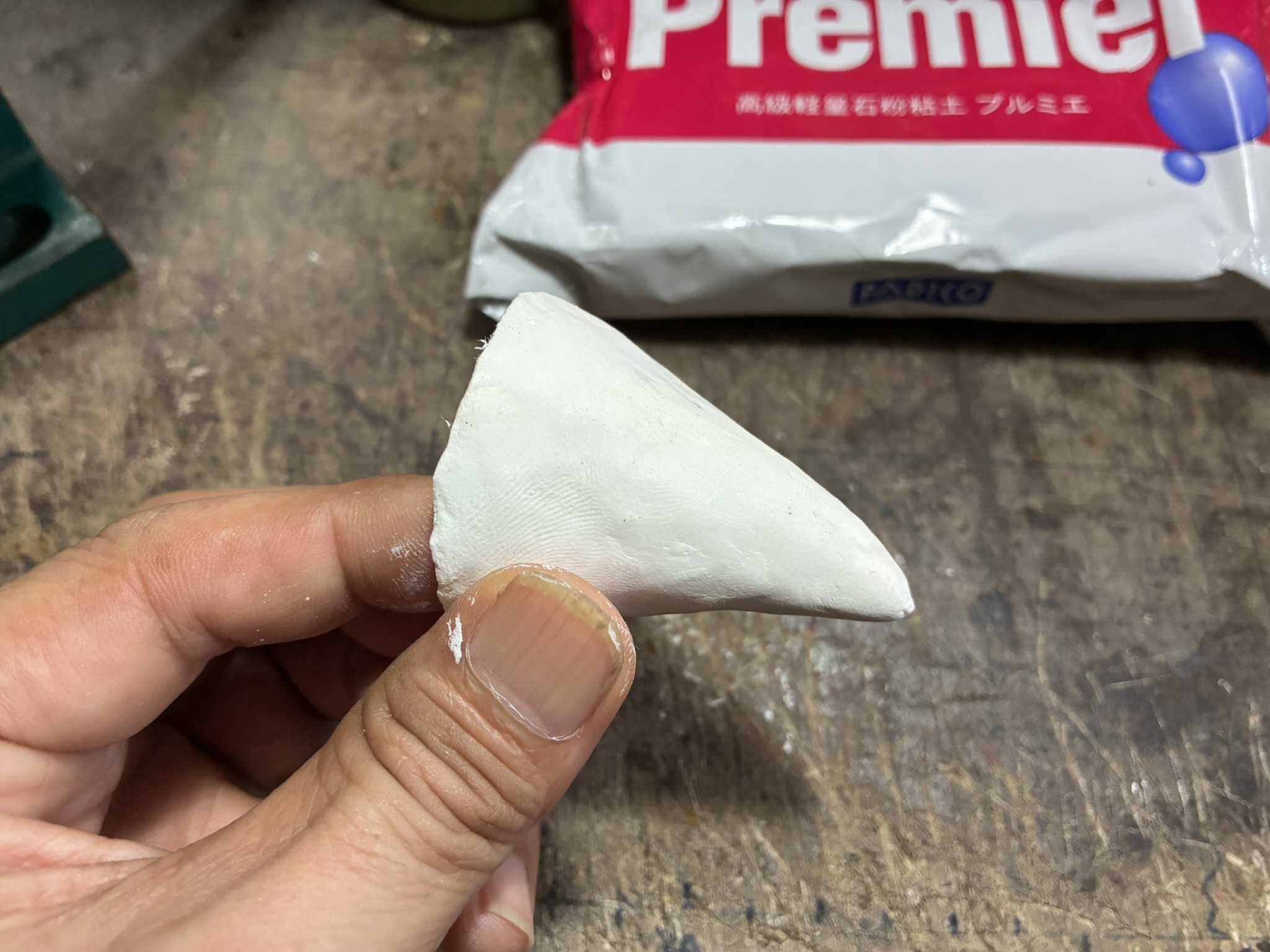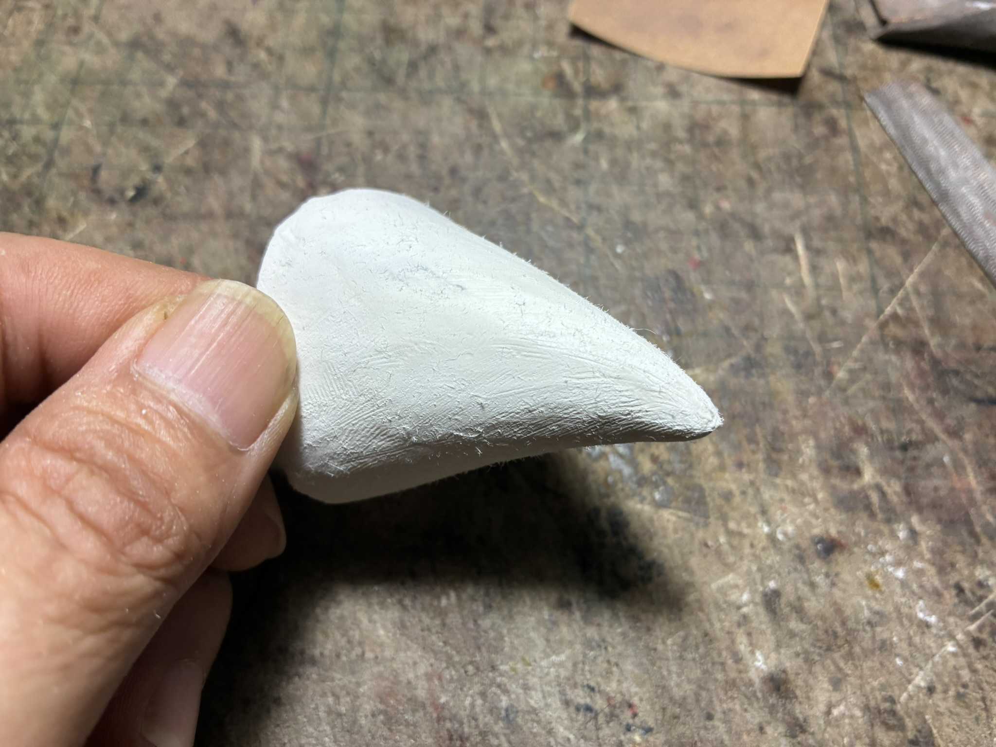 親ペンギンに尻尾を付けようと思います。どのように作るか迷いましたが、石粉粘土で作って革を張り込みます。粘土で形を作りました。外側が少し乾いてから、中の粘土をくりぬきます。
