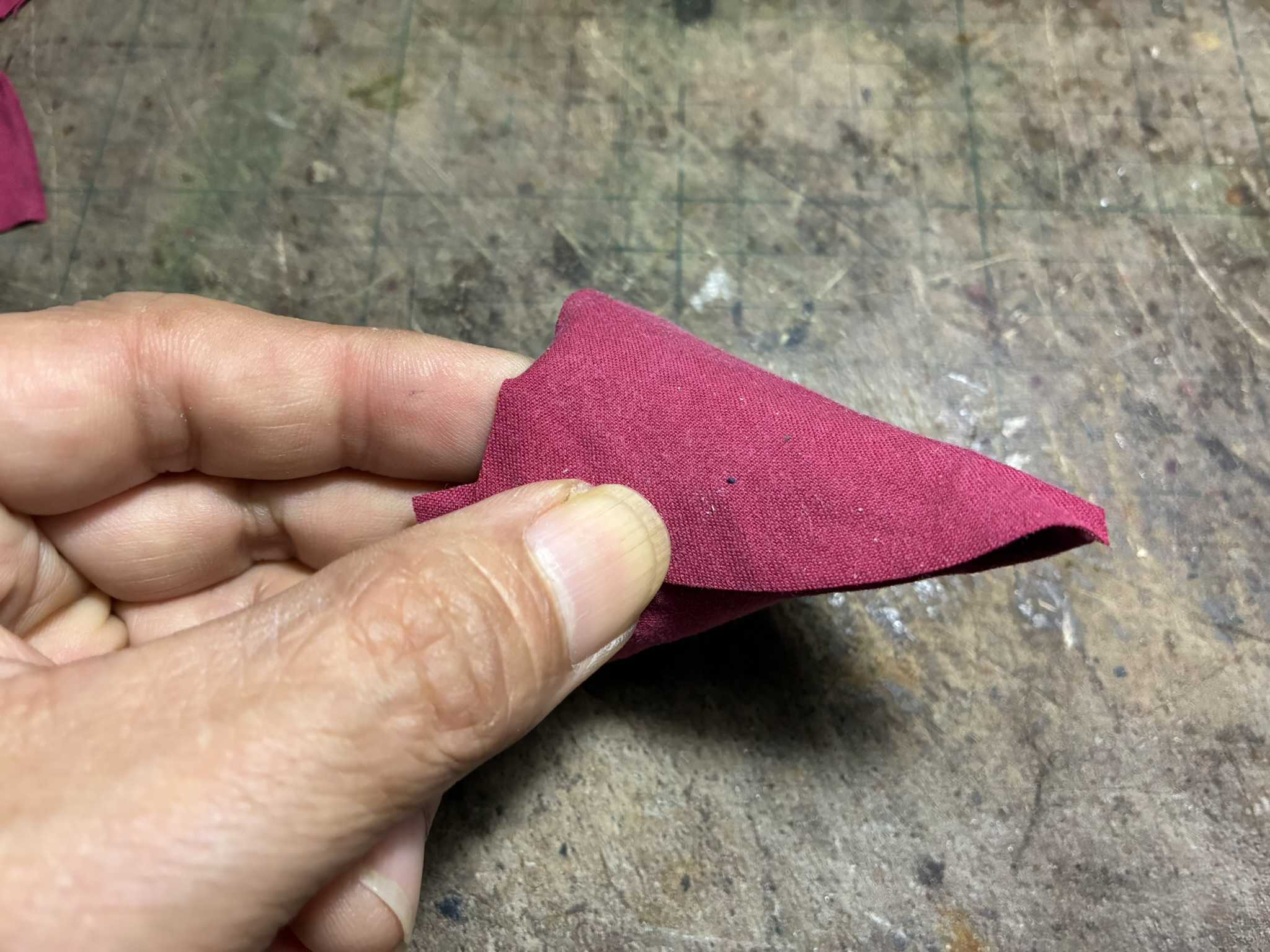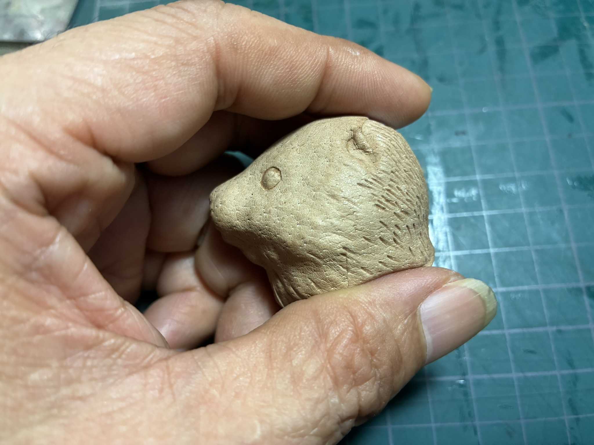 ハムスターの耳の頭に、革を貼り込みます。頭に布を当てて、型紙を作ります。型紙を基にして革を裁ちます。ブタ革(0.5厚)を湿らせて、木工ボンドで少しずつ貼り込みます。