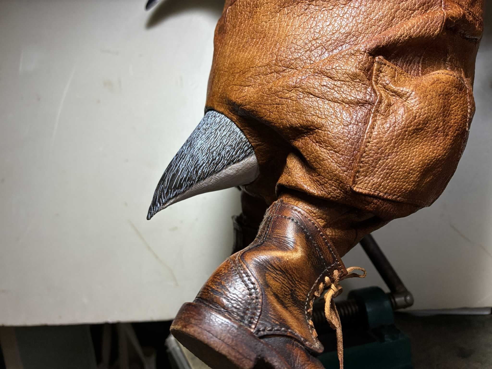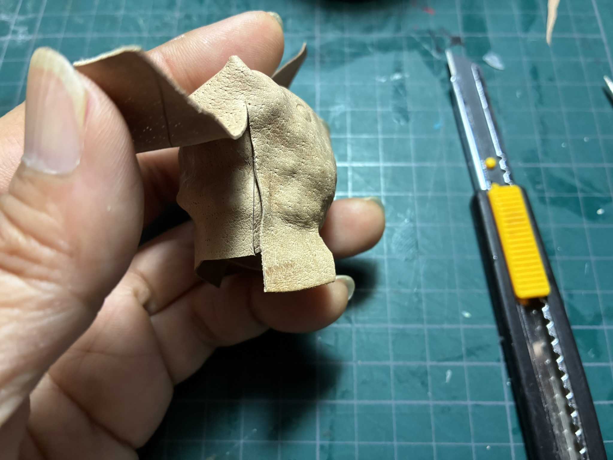 頭に革を貼る時には必ず余分な革が出てくるのですが、よく考えてから切り落とすか残すかを決めます。貼り込みやすい部分からひとつひとつ済ませます。