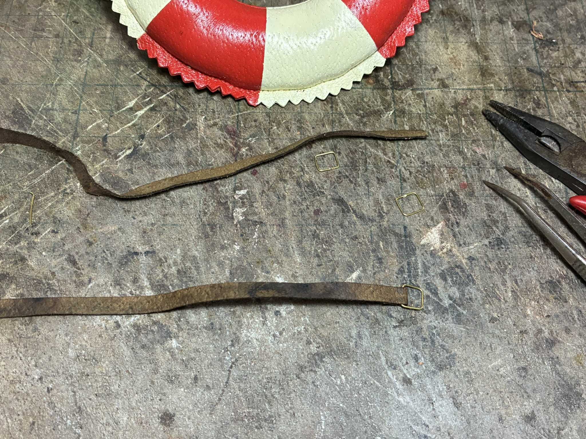 浮輪を体に提げるベルトを作ります。ブタ革を革用染料で染め、真鍮線の金具を付けます。