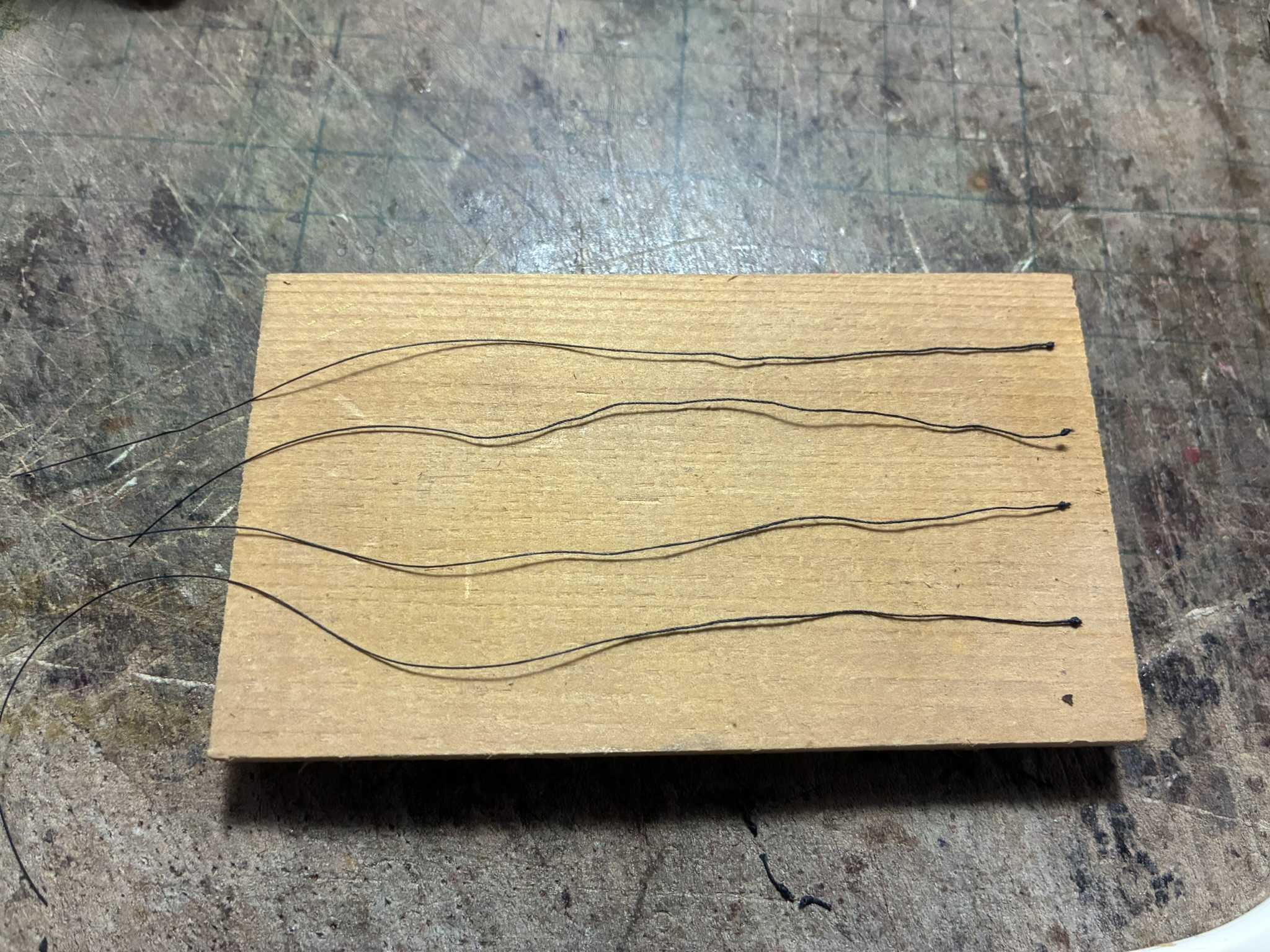 ウクレレのペグを差し込みました。糸を一つずつペグに巻いて、張っていきます。4本とも張り終わりました。
