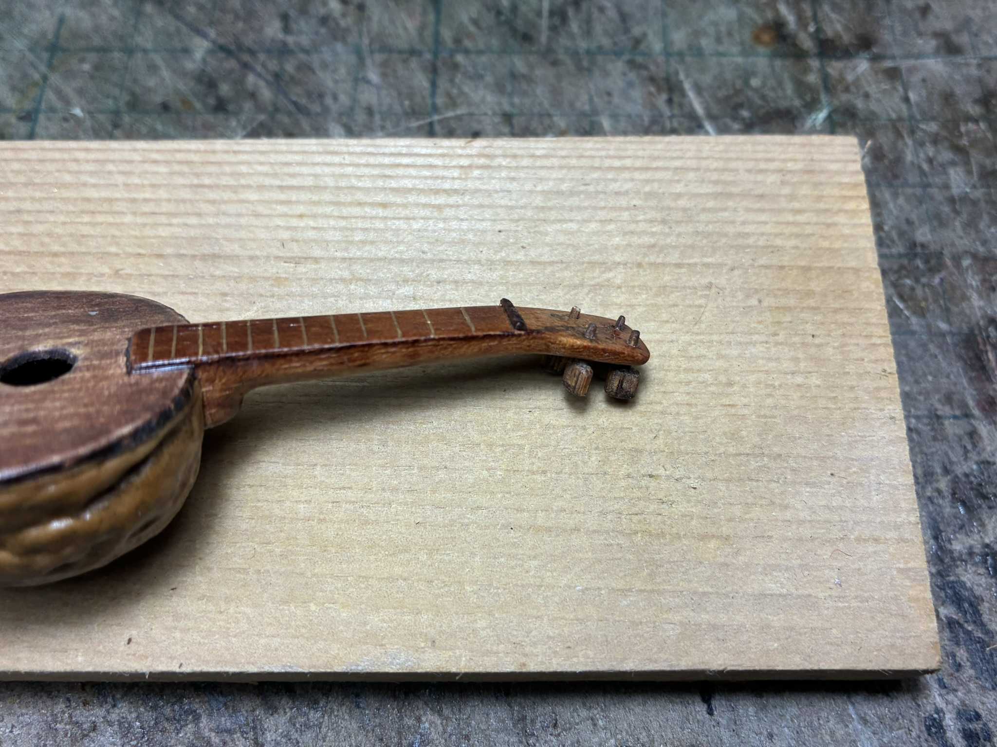クルミで出来たウクレレに、ドリルで穴をあけます。前回作った竹ひごにピンで、ベルトを付けます。ベルトをネックに留め付ける部分を革で作り、ピンも木部着色剤を塗りました。