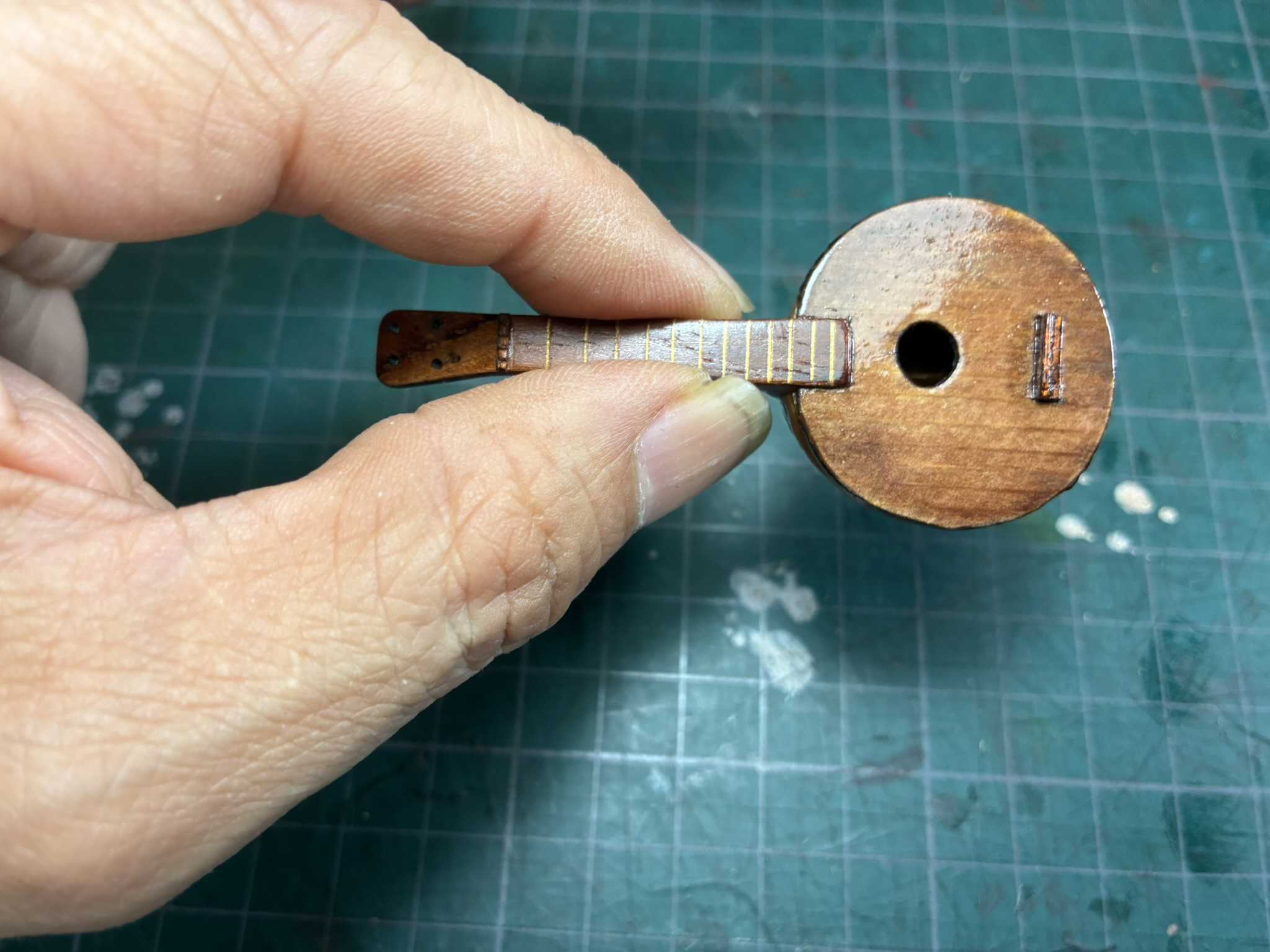 ミニチュアウクレレの弦を、糸で張ります。糸の片方の端に結び目を作りました。この部分をウクレレのブリッジの穴に留めます。ブリッジに付けました。