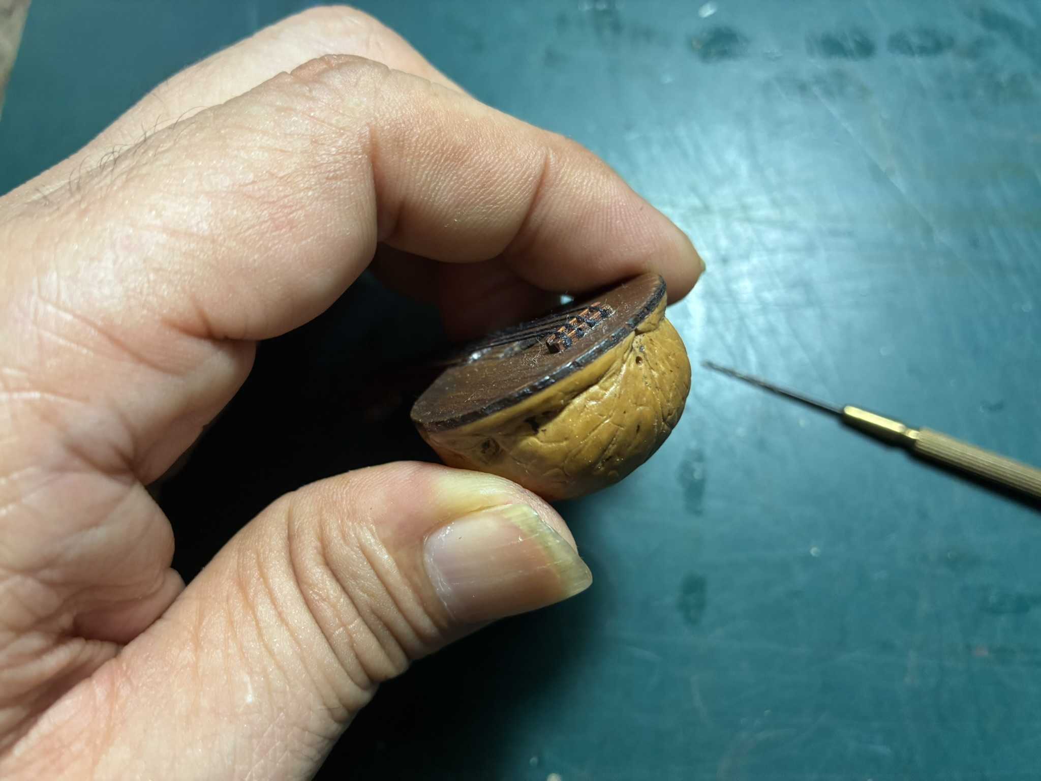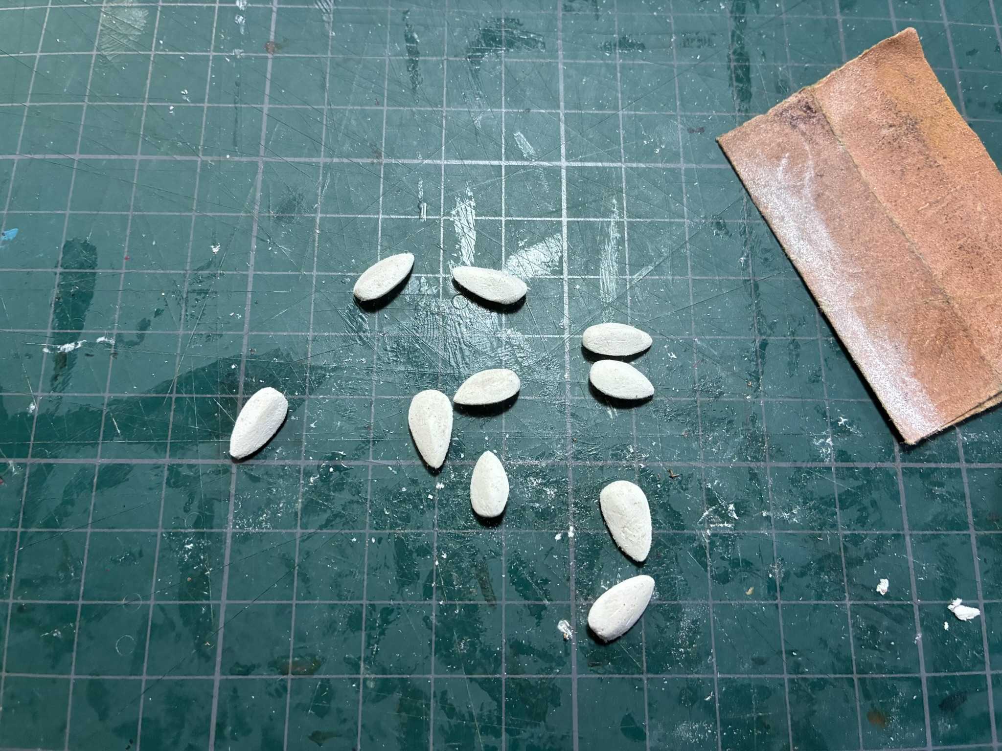 石粉粘土で作ったヒマワリの種に、サンドペーパーをかけます。羊革でヒマワリの種を挟んで、接着します。