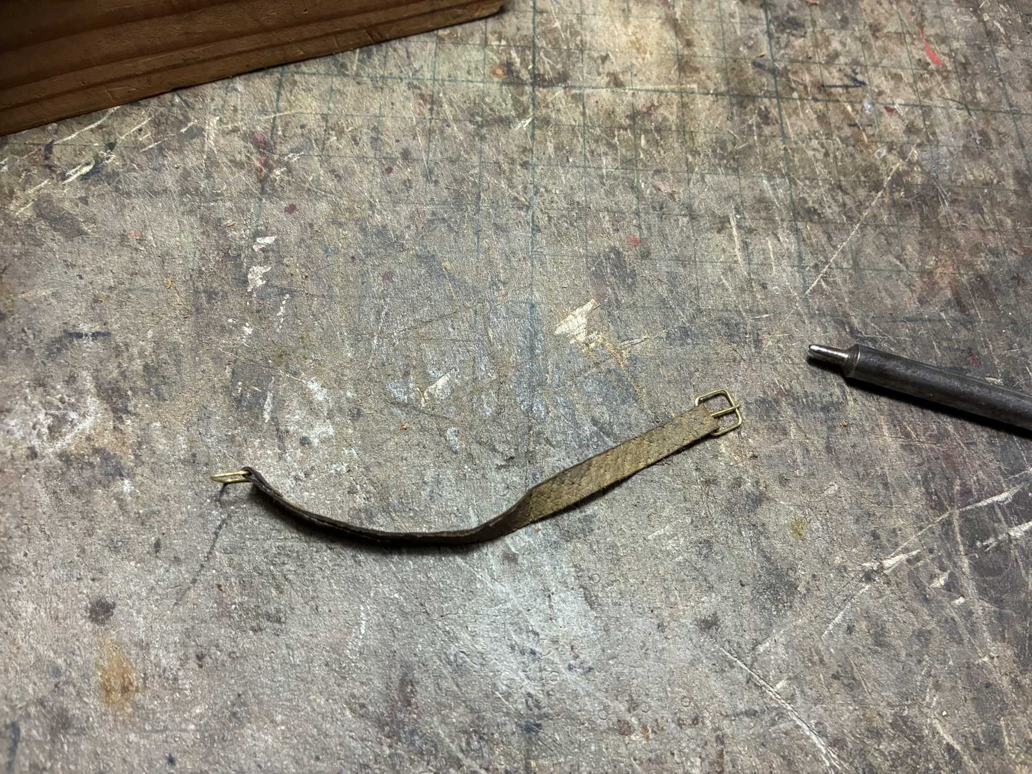 浮輪用のベルトを作ります。ベルトに角カンとバックルを付けました。バックルに剣先部を差し込んでみました。アンティックダイのタン色を筆塗りして、余分な色をふき取ります。