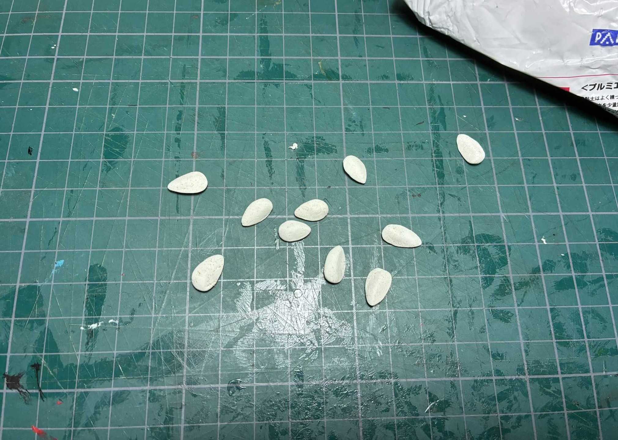 ハムスターの好物のヒマワリの種を作ります。石粉粘土でヒマワリの形を作り、乾燥させます。
