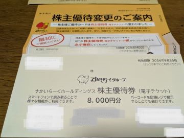 すかいらーくから、株主優待券が届いた。前回はカードタイプだったが、今回から電子チケットに変わった。QRコードを、読み取ってスマホで、保存し使用するように変わった。昔は、紙の500円の株主優待券だったが、電子チケットに変わった。でもまだ、郵便で配送されている。配送の仕方も、いつか変わるのかな?とにかく8000円分、バーミヤンで使いたいです。すかいらーく株主優待券