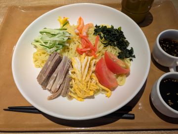 今日のお昼は、冷やし中華を食べました。トマトがのっているのがいいです。具材もきれいに並べられていていいです。醤油ダレは、酸味が少なかったです。麵も冷えていて、ツルツルと美味しく頂きました。レストランふじおやま 冷やし中華大盛り 1000円