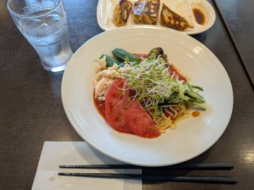 今日は、お盆なので墓参りに行きました。墓参りの帰りに、お昼を食べにバーミヤンへ行きました。夏野菜と蒸し鶏のトマト冷やし麵と本格焼餃子を食べました。トマト冷やし麵は、冷たいトマトソースが麺とよく絡んで、美味しかったです。トマトソースの味が、サッパリしていいです。餃子も、相変わらず外パリパリで中ジューシーでよかったです。バーミヤン 夏野菜と蒸し鶏のトマト冷やし麵 879円 本格焼餃子 219円