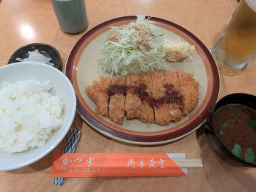 今日のお昼は、とんかつを食べました。ロースかつは、衣がサクサクで中のロースがジューシーで美味しかったです。豚肉は脂の甘みがあっていいです。ご飯が、べちゃべちゃして、あまりおいしくなかった。かつ半 特ロースかつ定食 2000円