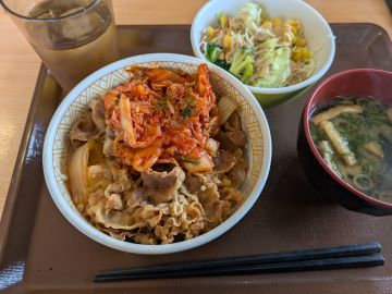 今日のお昼は、すき屋のキムチ牛丼でした。キムチが酸味があって、牛丼にあいました。牛肉とキムチのシャキシャキで美味しかったです。すき家 キムチ牛丼+サラダセット 810円
