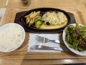 今日のお昼は、ハンバーグです。とろけるチーズハンバーグを食べました。チーズがたっぷりかかっています。チーズのほかに、オニオンソースをかけました。鉄板で熱々でいただけました。せんば自由軒キッチン。 とろけるチーズハンバーグ200g 1540円