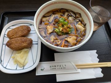 今日のお昼は、道の駅すばしりまでドライブに来て、レストランふじあざみで食べました。すばしりみくりやそばとおいなりを食べました。きのこがしいたけ、えのき、まいたけとたくさん入っていて、鶏肉も入っています。そばが太くて、食べ応えがありました。れすとらんふじあざみ すばしりみくりやそば 900円 おいなり 200円