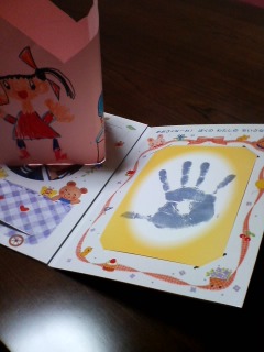 誕生会のプレゼントに実咲ちゃんの写真や手形の押してある大きなカードと王冠を貰いました(^^)