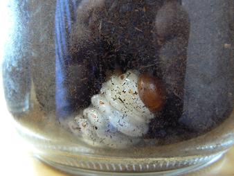 朝のブログで紹介したギラファ幼虫でしたが一度、気になりだすとどうにもならないもので・・・・速攻でビン交換しました。結果、5匹頂いて飼育していたのですが1匹が★に・・・・・2令のままの死骸を発見しました。しか~っし、残りの4匹は無事に3令に加齢してくれてました。体重は14~18g、雌雄は♂x2、♀x2でした。2x2になってくれたので累代という観点からするとなんとかなりそうです。な~んも専務さん・・・・一匹★にしてしまいました・・・お許しください。・元気なギラファ幼虫3令くんです。・4匹とも元気に潜っていきました。奮発して、♂♀ともに1.9Lの菌糸ビンに投入です。めざせ100mmUp!!