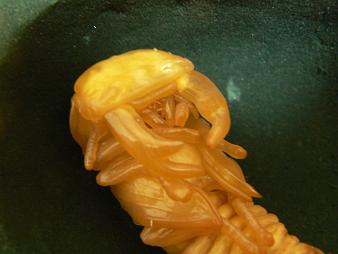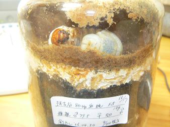 あ~春ですね~ってまだ2月ですけど!!最近暖かくなってきたのが原因だと思うのですが管理しているオオクワくんたちが続々と蛹室を作っております。思ったよりも温室の温度が高いのかもしれません・・・・2006/8/Eくらいの割出し幼虫たちなのでかなり早いです・・・は~。・阿古谷産 80mmUp血統 ♂79.5mm、♀50.0mm F5 2006/8/30割出し ♂ 推定24g?・は~やはりお尻にシワが・・・・せっかくの血統なのですが、このままでは小さく羽化しそうです。