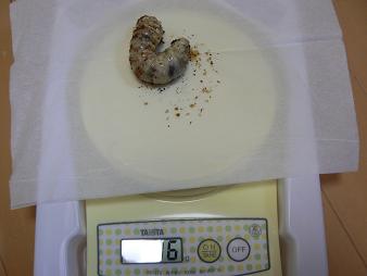 先日のブログで50gか~~~との予想まで飛び出した幼虫でしたが・・・・・・気になってしょうがなかったので休日の朝からビン交換してみました。・スマトラアチェ3令幼虫♂スマトラアチェの♂だけ交換しみてました。少し早いかな?というビンもありましたが投入から3ヶ月経過しているので思い切って交換です。写真は3匹ですが結局5匹の♂の交換となりました。・スマトラ アチェ 3令♂ WF1 割出 11/1(卵) 先日のブログで紹介した固体です・・・・え~、50gにはぜんぜん届きません・・・・期待が大きかっただけにちょっとがっかりです。まだ透明感が残っているのでもう少し成長するでしょう。70gくらいいってくれればよいのですが。体重測定の結果は20,30,30,30,41gでした。30gくらいでの早めの交換がひとつの目安なのでまあまあよい結果でした。2本目でどこまで伸びるか期待です。
