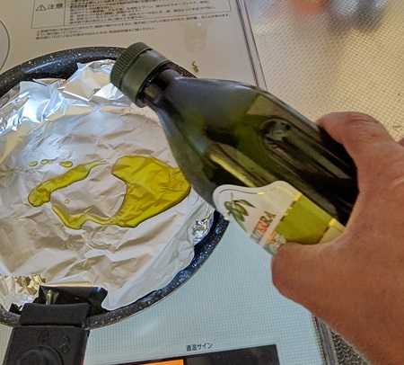先ずはオリーブオイルをフライパンの上に敷いたアルミホイールに回し入れ