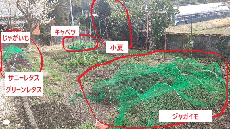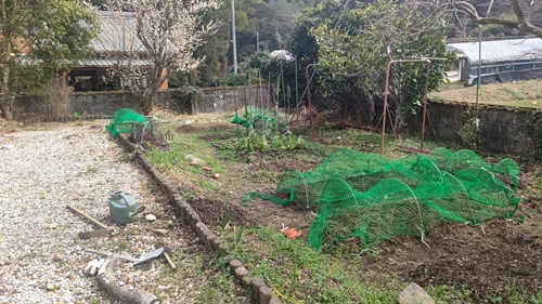 一昨日植えたキャベツとサニーレタスなどもそれなりにではあるが網をかけ防御している