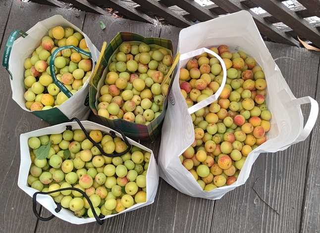 沢山の実が固まって成っていたので、一回に5つ6つを手で取り、バケツに入れていった  小一時間で、10キロほどの小梅を収穫