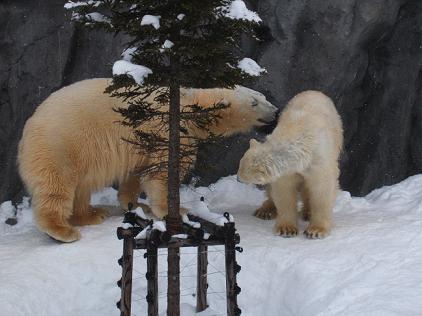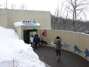 先日 冬の旭山動物園に行ってきました!3月とはいえ 激寒なので 温かい格好で~今回の目的は 「オオカミの森」です。昨年6月にオープンした新しい展示施設です☆ 入り口をパチリ…入り口のイラストも相変わらずかわいいです。中に入り階段を上ると 「ヘアーズアイ」という観察コーナーになっています。 オオカミの捕食対象ユキウサギの目線でオオカミを間近で観察できるんです! 中から見ると こんな感じ。おっと ケン(兄)とメリ(妹)ーが じゃれてるじゃれてる♪施設の外に出ると 全く檻の無いゾーンがありました。 檻がない・・・・!!大丈夫なんでしょうか~!!ひょいっと飛びえてきそうなほど… ちか~いわたしは どうぶつが大好きなので食べられてもいいや…くらいの気持ちで間近で見ていましたけど怖いひとは怖いかもしれませんけど 迫力満点です!!口笛を吹いて交信してみたところケンと3秒くらい見つめあいました黒い体にブルーの鋭い瞳・・・かっこいい(見つめていたので 写真間に合わず)あれ??兄妹のケンとメリーの他にクリスという大人の雌が居るはずなんですが 姿が見えません当初 動物園の予定ではケンとクリスが繁殖するペアになるように…と計画していたそうですがその後気弱なクリスが ケン&メリー兄妹に馴染めていないという話は聞いていました。んでクリスはどこに??2月7日に闘争の為死亡…「喪中」の看板がありました オオカミは順位を重んじる「群れ」での生活をする動物なのでクリスの順位がとても不安要素だったようです。幼く結束の固い兄妹 ケン&メリーに対し、気弱で 人間に甘えがちな雌のクリスケン&クリスの 二世誕生を待ちわびていたところ…2/7の朝に突然クリスだけが 怪我をして亡くなっていたそうです。雌同士の上下関係や ペアとしての関係が はっきりとしないままクリスに発情期が来てしまったことが今回の出来事の一因。兄ケンなのか?妹メリーなのか?発情の来たクリスを排除しよう… とする感情が強く働いてしまった結果と思われます。難しいですね…。自然のオオカミらしさを展示しようとする反面過酷な現実も起きてしまいました。でも このまま 兄妹で ペアになってしまっては 近親交配の危険もあります。どうなる?オオカミの森ちなみにこのコたちは カナダに生育する種の シンリンオオカミです。北海道には明治維新以前 エゾオオカミが生育していましたが今は 絶滅しています。悲…とても悲しい歴史があるのですが また いつか…さてさて旭山動物園は まだ 若干 寒いけど冬好きなどうぶつたちが 元気でかわいいのでとっても 見ごたえがありますよ!4/7まで(冬季は10:30~15:30まで) 開園してます。まだまだ雪もあるのでぜひ(防寒して)行きましょう!*HOME*トップページにもお立ち寄りくださいませ♪