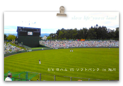 8/4に 旭川で日ハム戦が開催されました。バスに乗り合わせて お友達と行ってきました!!ずっと楽しみにしてたの~♪ わくわく。バスで行けば ビールも飲めるしね~♪GO GO ファイターズ~札幌ドーム戦には 何度も行ったことがありますが近いはずの旭川戦には 今回が初めてデス。場所は、旭川スタルヒン球場。外野席も たーーーくさんのファンでいっぱいでした。外野の応援は、素晴らしく熱くって、総立ちでした。一方、我々は 外野ではなく内野指定席で観戦。ファン初心者なもので内野でひっそり応援ですそして、せっかくの日ハム戦に持参したデジカメが電池切れという悲劇に…。今回は携帯写真です。あしからず。福岡ソフトバンクホークスとの熱戦は、面白かった!!結果は 6-4で 日ハムの勝利でしたもーこの日は熱かった。うん。暑かったぁぁ。旭川スタルヒン球場は、野外の 古い シンプルな球場なので指定席といえども コンクリートベンチです。日陰のない炎天下の席で 暑い暑い。肌をさす日差しに耐えきれず、グッズ売り場で 日ハムロングタオルを買う。でもあれれ・・・?なぜか去年(2009年パリーグ優勝)のだったなんで?なんで?? ←アウトレットのグッズ売り場だったらしい。午後1時スタートの試合だったので お昼は 球場の売店で買いました。昭和チックなたたずまいでイイ感じな球場と売店!なんだか わくわく 楽しかったですよ。珍しいグルメは 期待できませんけれど(笑)お弁当やたこ焼き、おにぎり、おつまみ、飲み物は 売店で買えますし、熱々のうどんなどもおいしそうでした~。わたしのオススメは ジュンドッグです。旭川の名物?ですー。花火大会や野外の催しなどには ジュンドッグの売店が来てることが多く外で食べると 夏だわぁ~と思います。どんなものかといいますと、洋風なおにぎりデス。お米のなかに 海老フライやチキンカツが入ってて紙に包まれているので 食べやすいのですぅ。来年も 旭川スタルヒン球場で日ハムを観れたらまた ジュンドッグで観戦しよ~っと♪そして 試合後、帰り道に人混みができかかっていたのでなんとなく ならんでみると…なんと 出待ちの列でした。初めて わたしも出待ちしてみました。あぁ・・・カメラが携帯のみ。残念。わー バスが!!タクシーにニ岡選手が!田中選手が手を振った!森本選手がいた!小谷野選手がわたしを見て手を振ってくれた!中田選手がいた!糸井選手が大きかった!わー! わー! わー!大興奮でした。出待ちにまで付き合ってくれたお友達に心から感謝しつつまた観たいなー… 来年のスタルヒン球場を想って またわくわくするのでした。@HOMEにもどうぞ~ トップページ雑貨おすすめUP@ 応援ありがとうございます!毎日の励みになりますぅ!ファイターズ応援グッズも ついつい増殖中。 夫が 今年からファンクラブに入ったので先日 札幌ドームに行った際に来場ピンバッチをもらってきたら尾崎選手でした。←ランダムに当たる。うーん。。。いい選手です応援するわ次は ダル君のバッチが当たるといいなー。