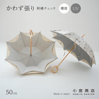 傘 日傘 晴雨兼用 レディース 小宮商店「かわず張り 刺繍チェック」両面 コットン リネン シンプル ナチュラル 50cm 8本骨 おしゃれ かわいい 修理 ギフト ネイビー ベージュ ブラウン デザイン uv uvカット