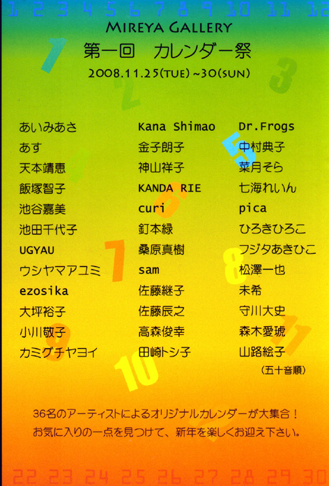 *第1回 カレンダー祭* ミレージャギャラリー 東京都中央区銀座2-10-5 03-6303-8844 11/25(火)~30(日)11:00~19:00(最終日17:30まで)写真は、会場の様子(ホントは、もっとアップしたいけど・・できない理由が下記に)36名・36種類のカレンダーは、想像以上にバラエティー!!各作家さんのアイデアあふれるカレンダーが揃いました♪(この会場でしか 手に入らないのもアリ)搬入&展示は 凄い熱気で外は寒いのに室内では冷房を入れるくらい(笑)まず、展示場所は「くじ引き」終わってみると不思議にまとまっていした。私は DMと同じ~ど真ん中をGET.連番には 知り合いの作家さん達だったので おしゃべりしながらも肩幅くらいのスペースにレイアウトを考える・・・チラチラっと 他の展示作業を見ては「凄いなぁ~~!!」「工夫してるなぁ~~~!!」もう感心しきり。良い刺激になります♪「実は、朝まで印刷してましたよ」「搬入ギリギリまで 準備してました」「これ(台紙)も手作りです」それぞれの想いが込められたカレンダーを 見に来てくださいね♪(今回会場には30日午後のみ在廊です) ★☆★☆★☆★☆★☆実は、また新Macが故障(*_*) この間~修理してもらったのにドライブがおかしい。本体が起動しないし、CDも読み込まない。うぅ・・・旧Macでは不便さもあるのですが今週は「描く・描く・描く・・・」の お仕事なのでMacさんが退院してくるまで ジッと我慢の子(^_^;)すぐにフリーズする旧Macちゃんでは絵文字も使えないし~ 写真も連続でアップできないし~ ・・・・・・・・・・・ジッと我慢の子(^_^;)「修理、また3度目なんて無いように~お願いしますね!!」 ・・・・・・・・・・・ジッと我慢の子(^_^;)さて、アナログ仕事に 戻ります(^_^)v
